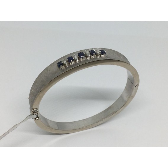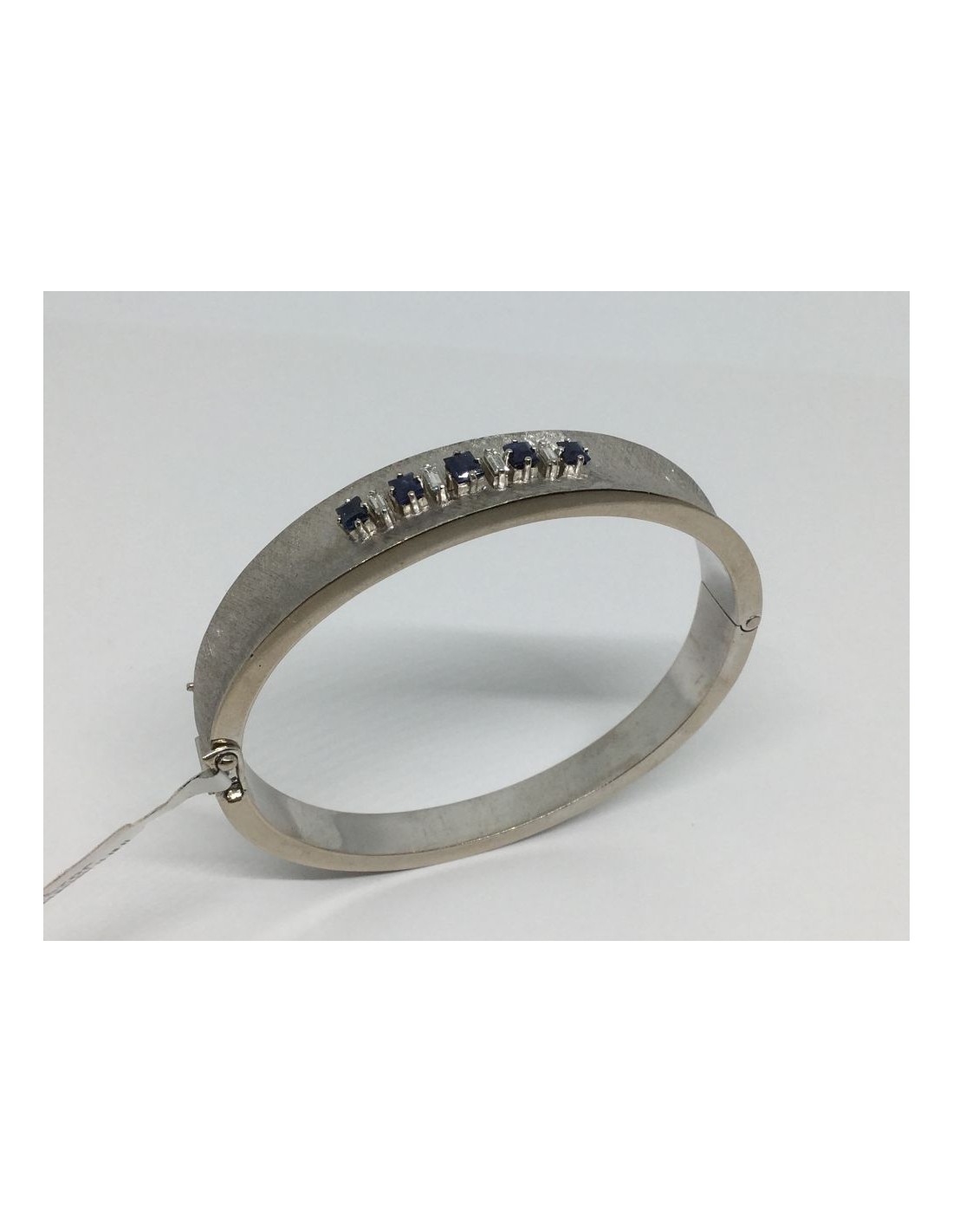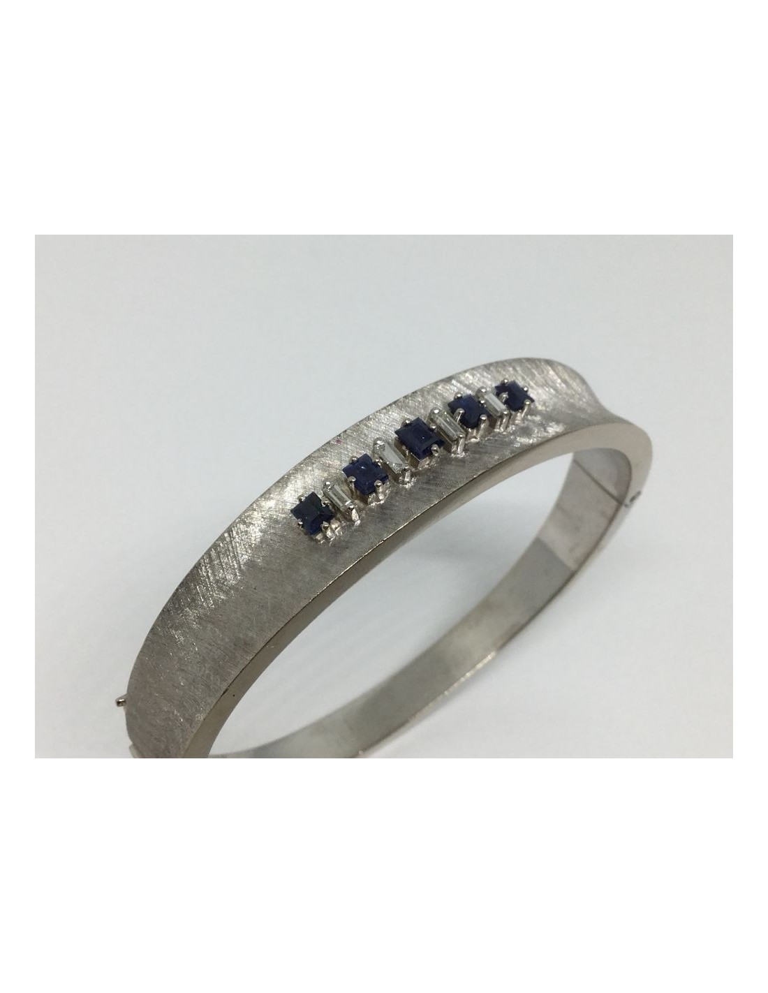 Pulsera esclava de ocasión en oro blanco con centro de diamantes talla baguette y zafiros. Diámetro: 6,5 cm. Peso: 35,5 gr.