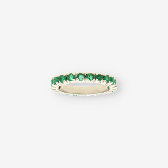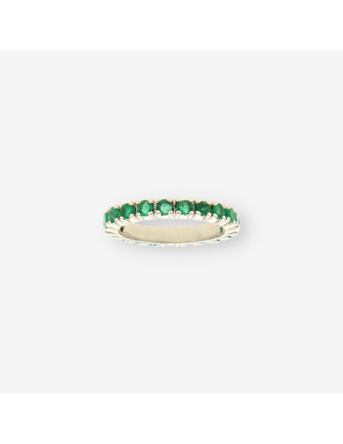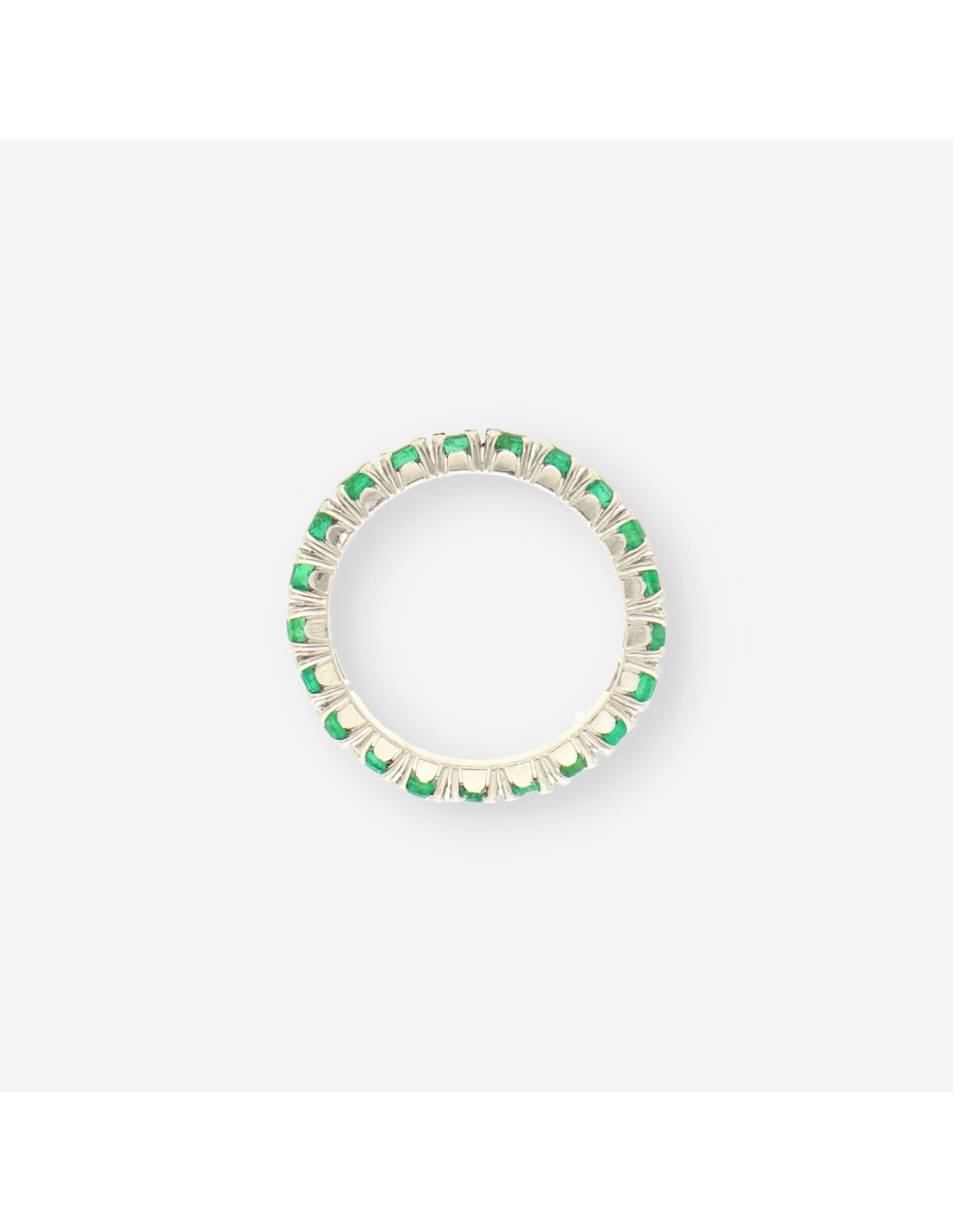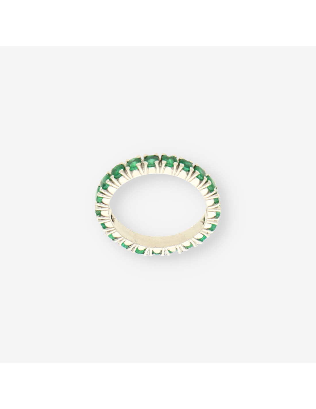 Preciosa alianza de segunda mano en oro blanco, con un diseño clásico compuesto por esmeraldas en toda la pieza. Pesa 6.4 gramos, tiene una talla 18. Ideal para destacar en cualquier ocasión.
