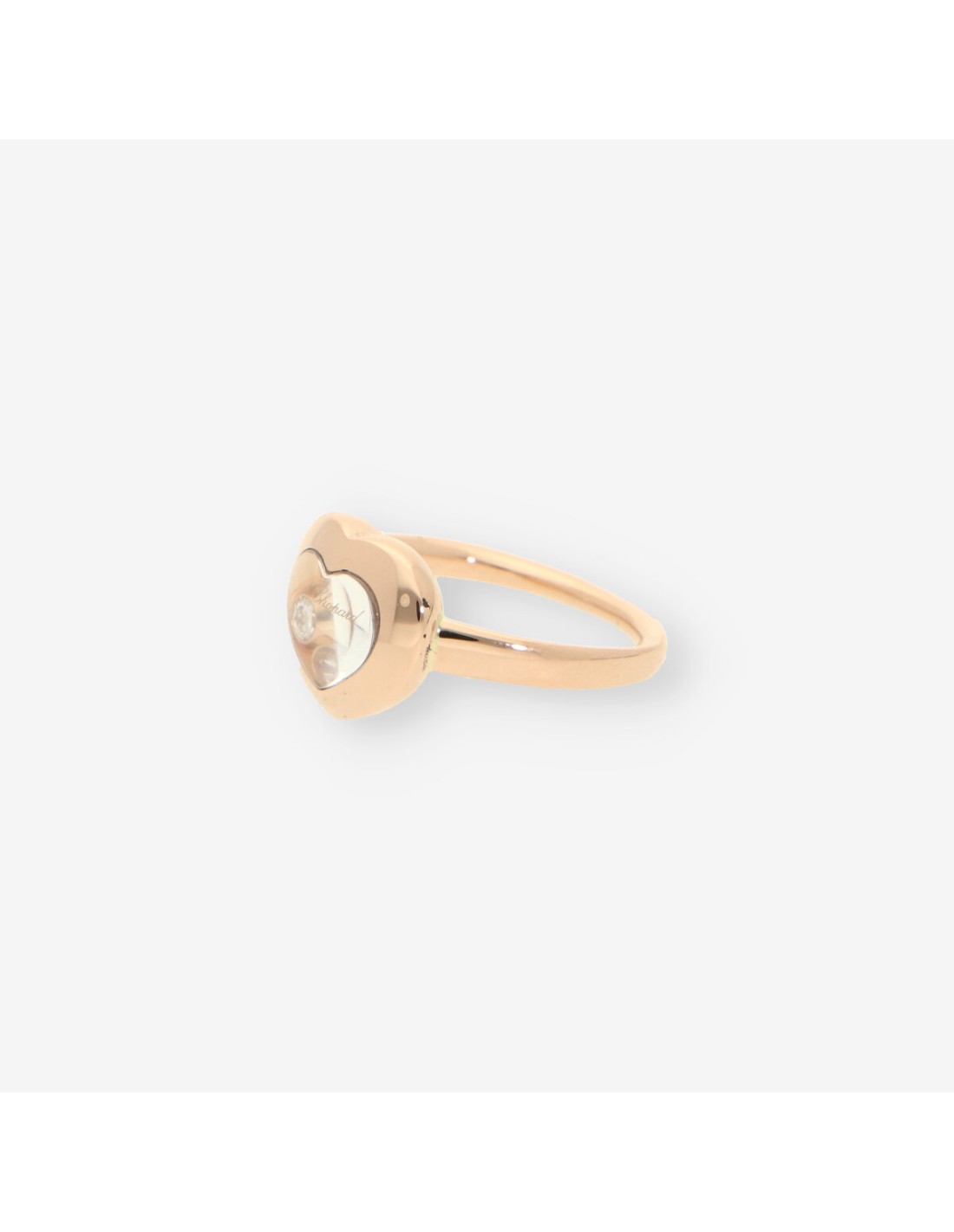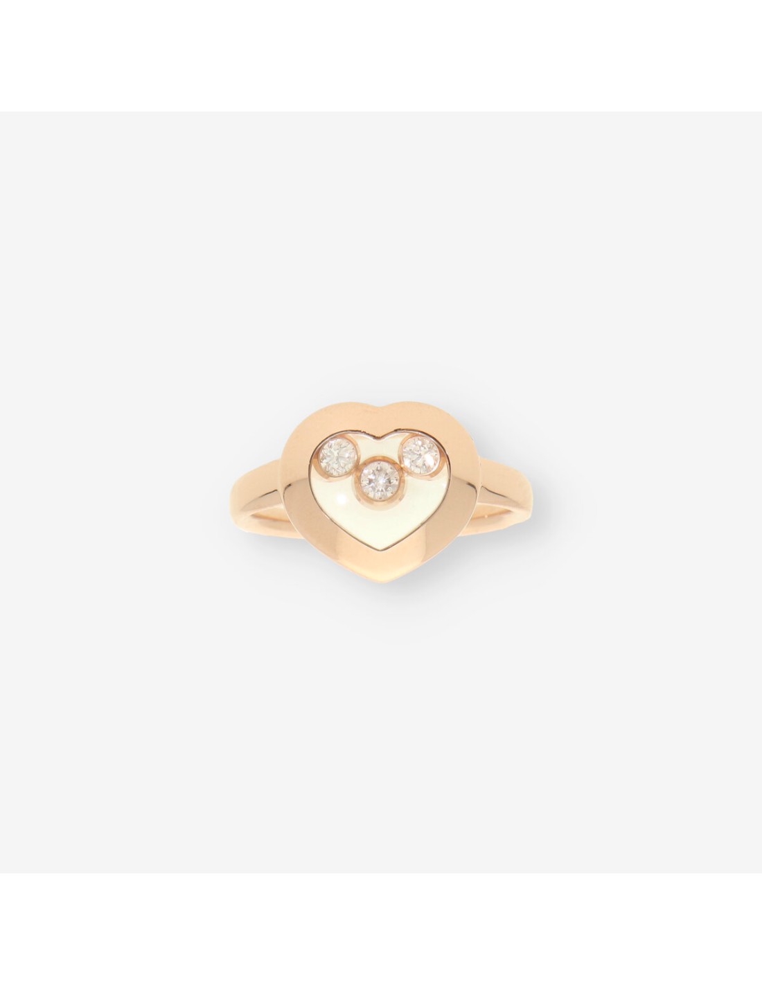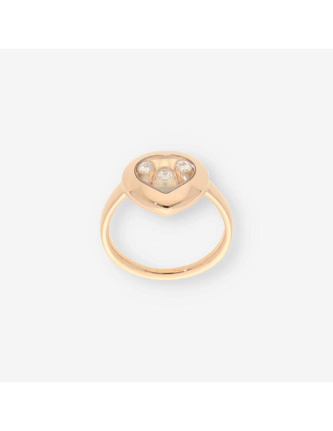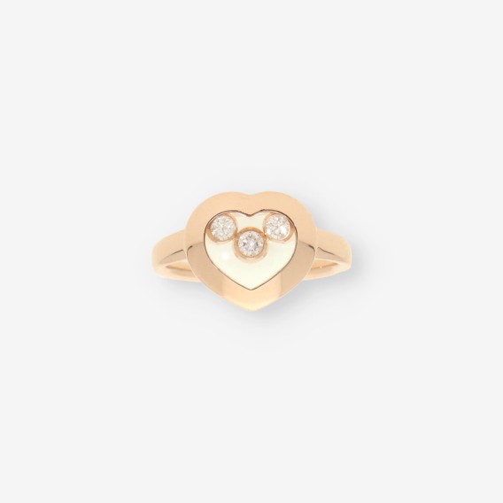Anillo Chopard Happy Diamonds en oro, con un delicado diseño en forma de corazón. Luce 3 brillantes diamantes móviles que aportan un encanto único y elegante. Pesa 6 g y está en talla 12 (52). Una joya icónica que combina sofisticación y romanticismo.