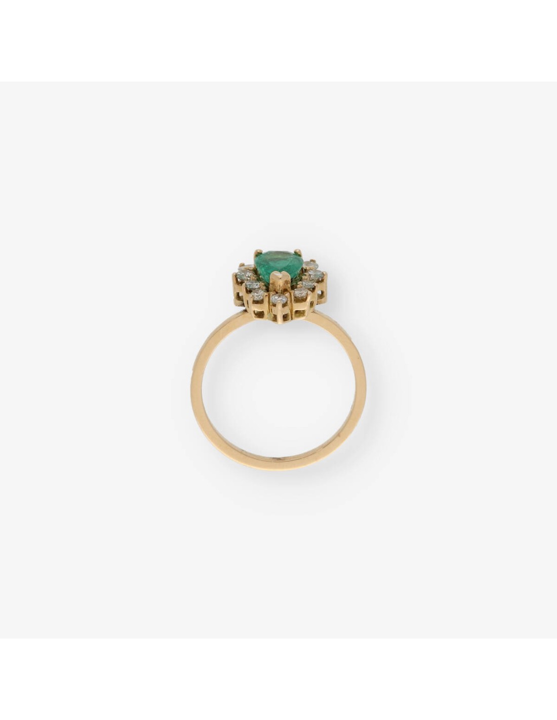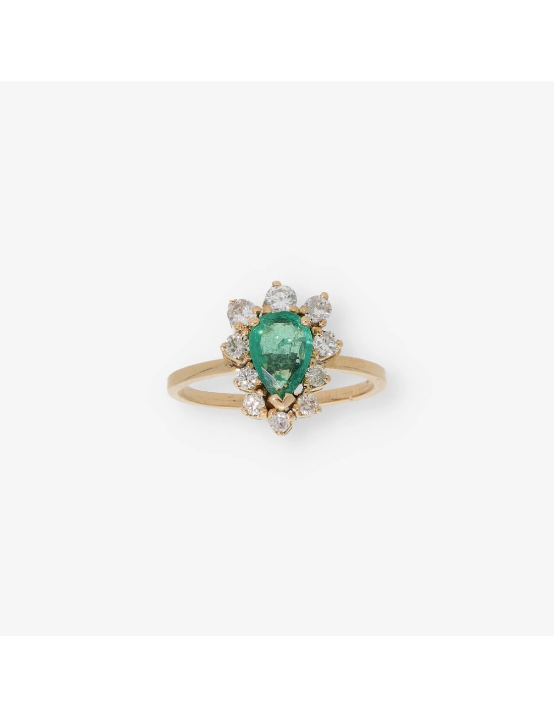 Precioso anillo de segunda mano en oro amarillo de primera ley con brillantes y esmeralda central. Talla: 16. Peso: 4.1gr.