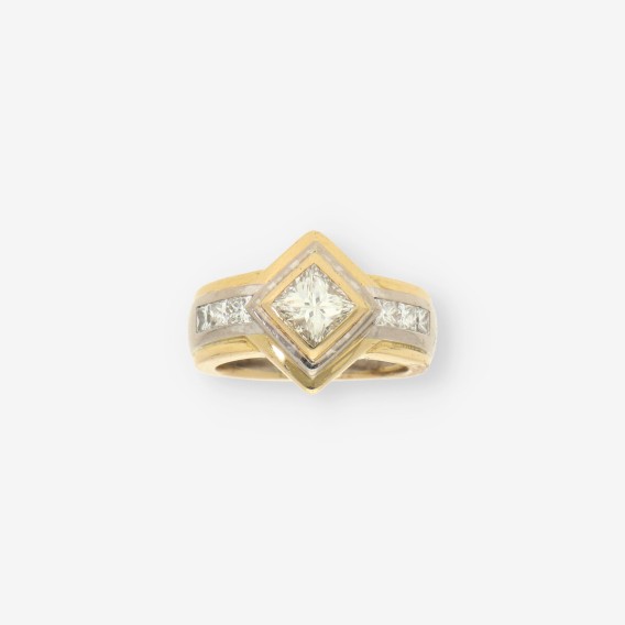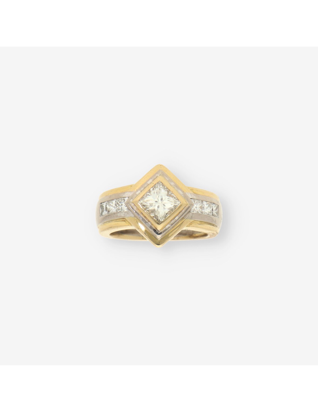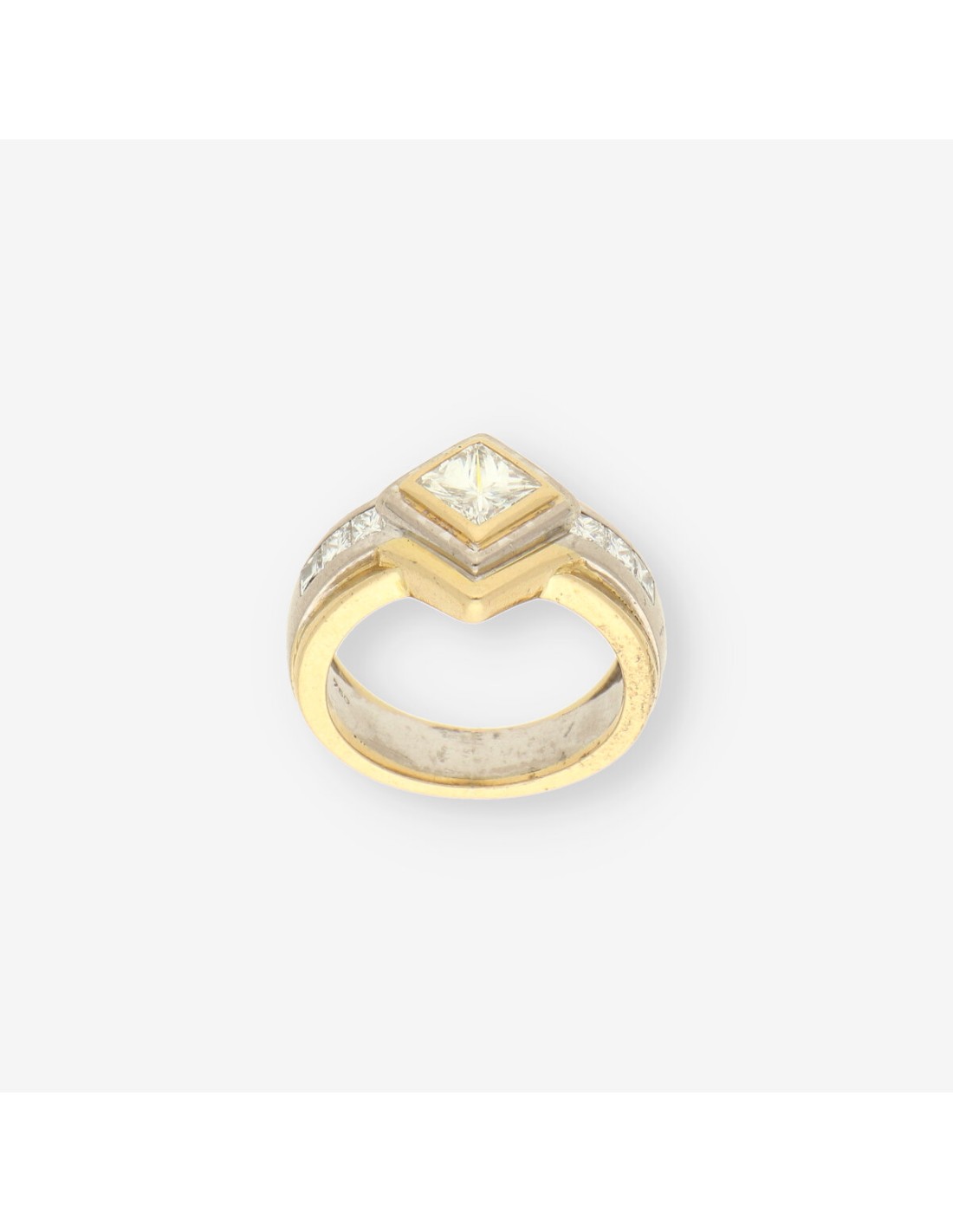 Este anillo de segunda mano, con un peso de 13.3 gramos y talla 12, presenta un diseño innovador que une el elegante oro blanco y el cálido oro amarillo, creando un juego de contrastes único. En el centro, un brillante de talla princesa capta la atención, mientras que los brillantes adicionales incrustados a lo largo de la banda añaden un destello continuo y sofisticado.