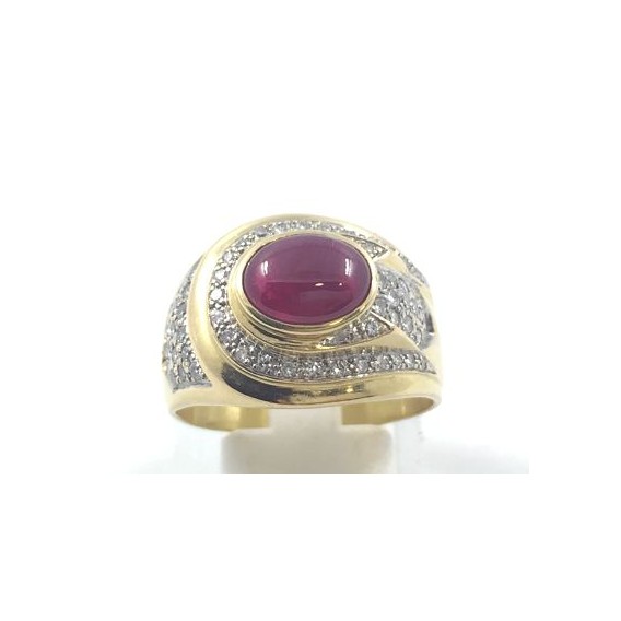 Anillo de oro de 18 kt. con brillantes y granate central talla cabujón. Peso: 12,7 g. Talla: 24.