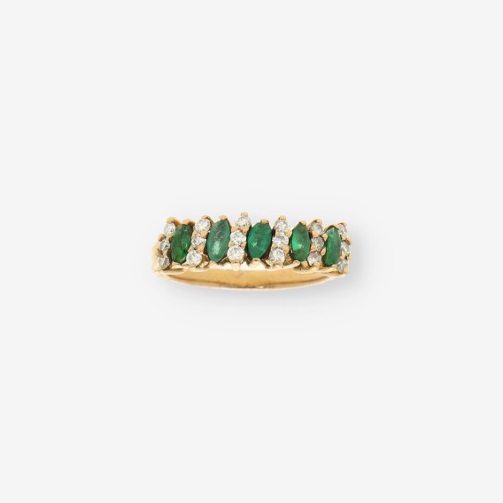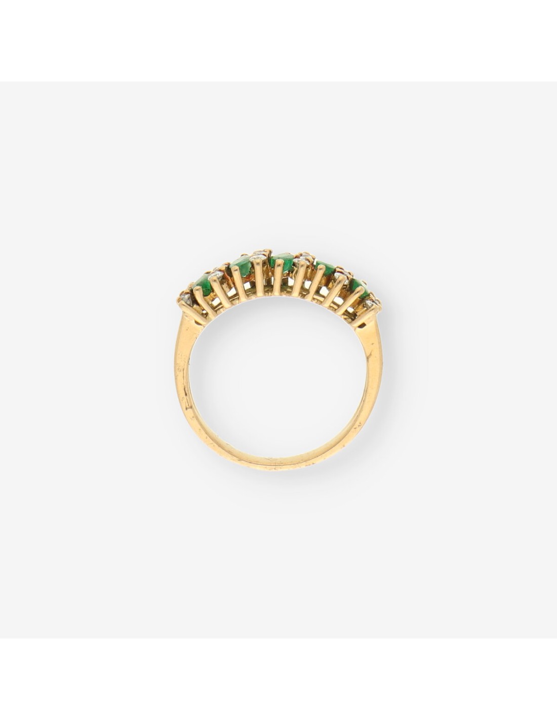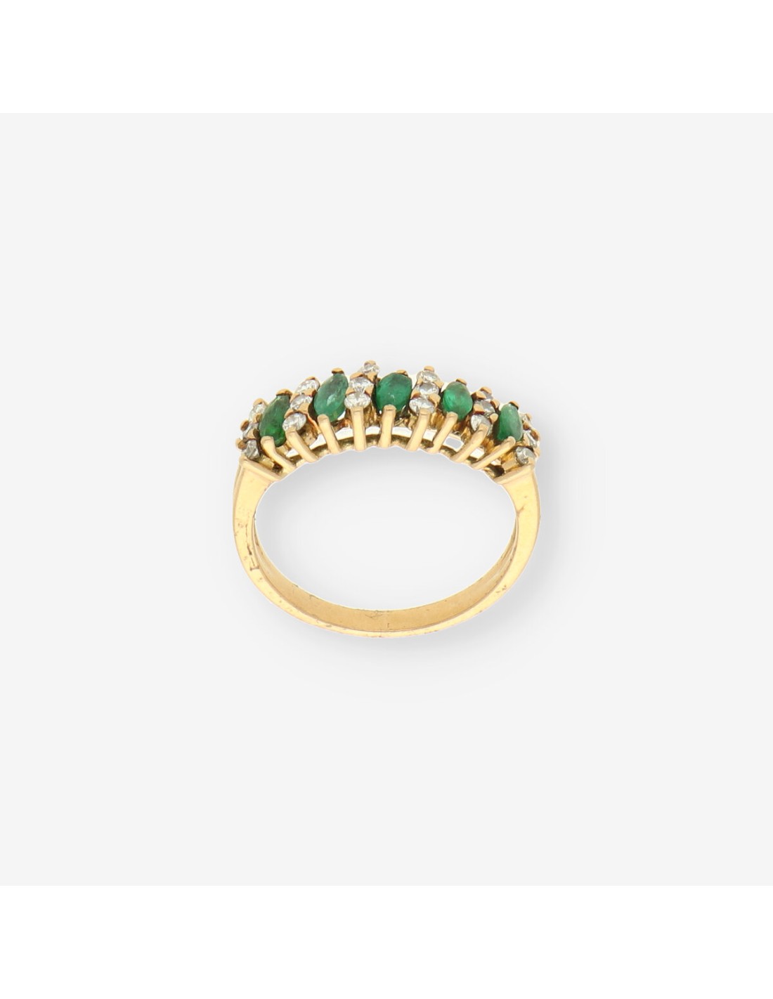 Refinado anillo de segunda mano con esmeralda central y brillantes circundantes.
