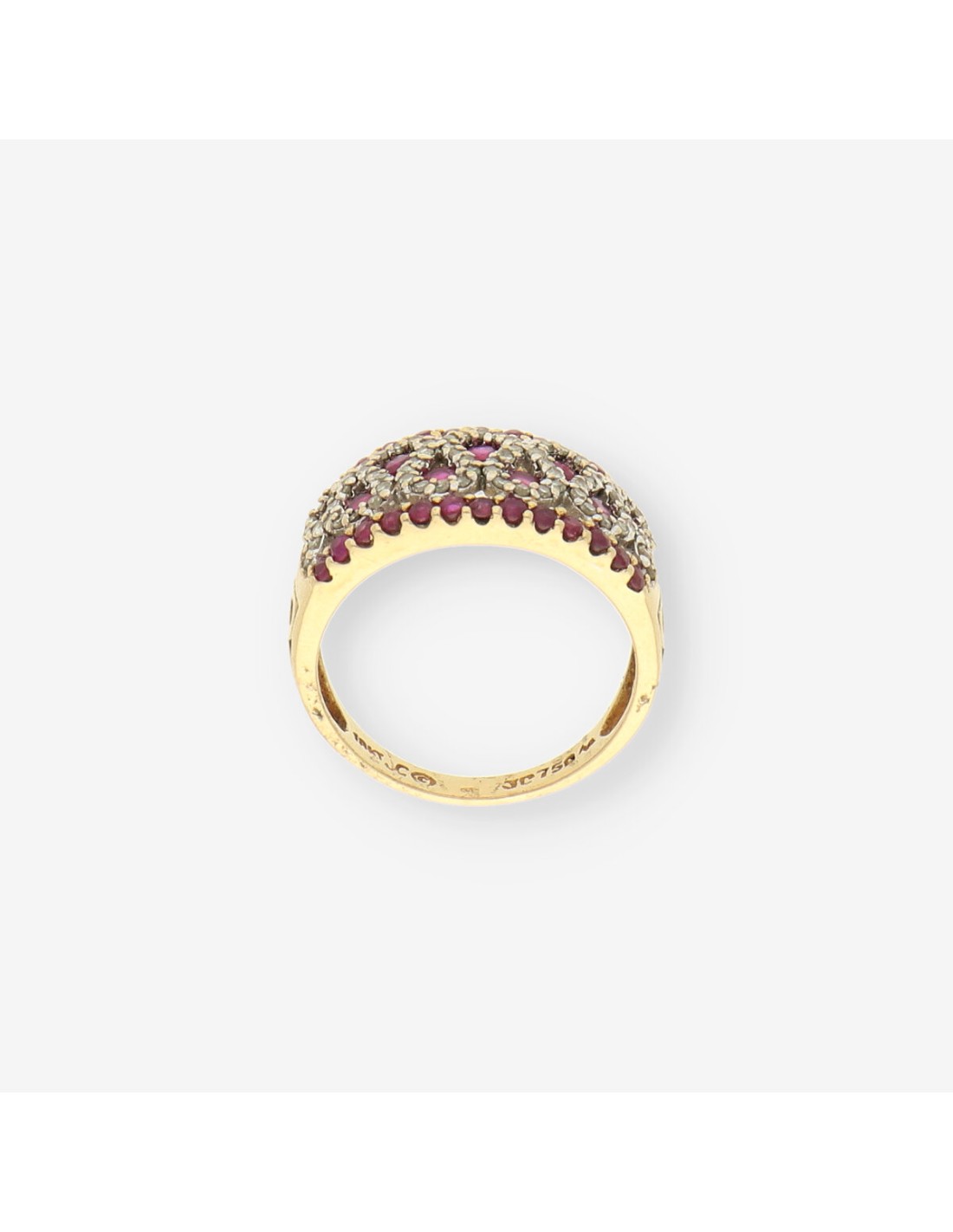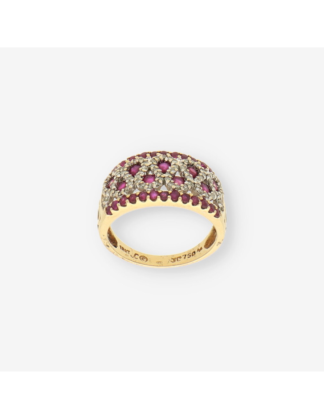 Elegante anillo de segunda mano con rubí central y brillantes circundantes.