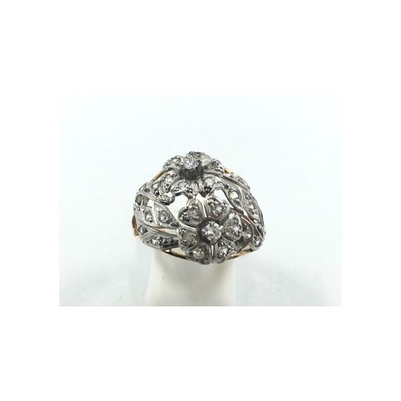 Antiguo anillo de segunda mano en oro de 18 kt. y frontal de oro blanco y brillantes. Peso: 4,6 g. Talla: 12. Precioso anillo vintage, años 40 del siglo XX, con decoración floral.
