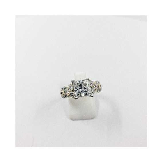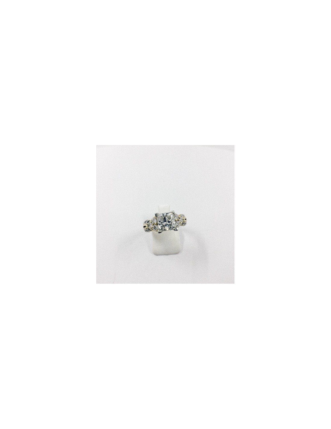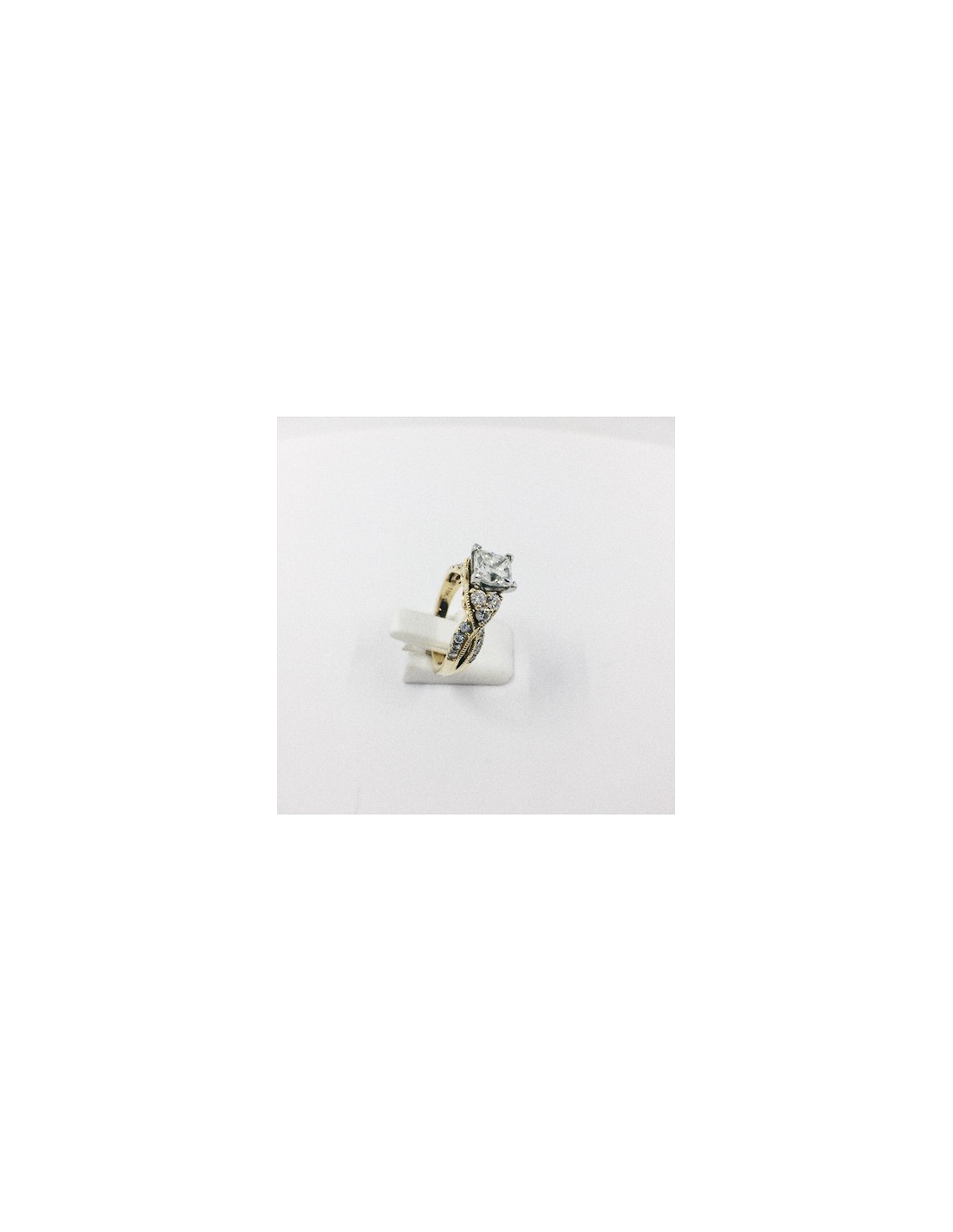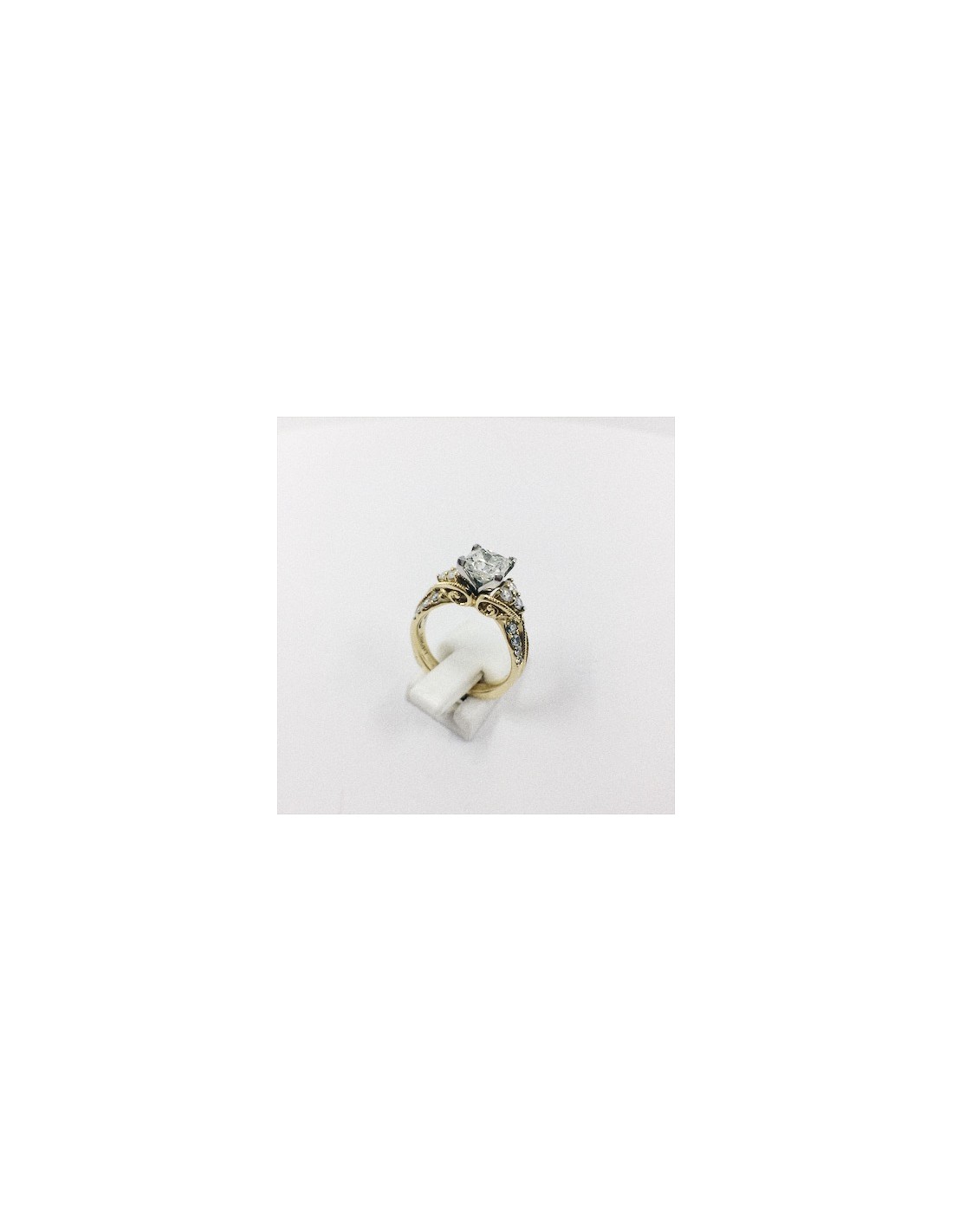 Anillo de segunda mano en oro amarillo de 18 kt. con diamante central talla princesa rodeado de brillantes. Talla: 14. Peso diamante central: 1 que. aprox. Peso: 8 g.