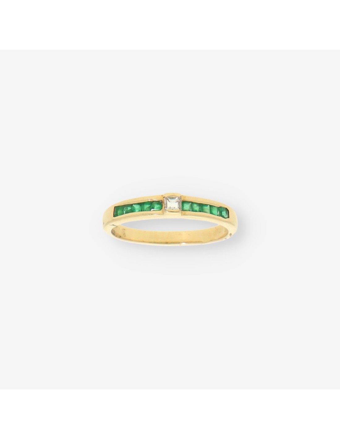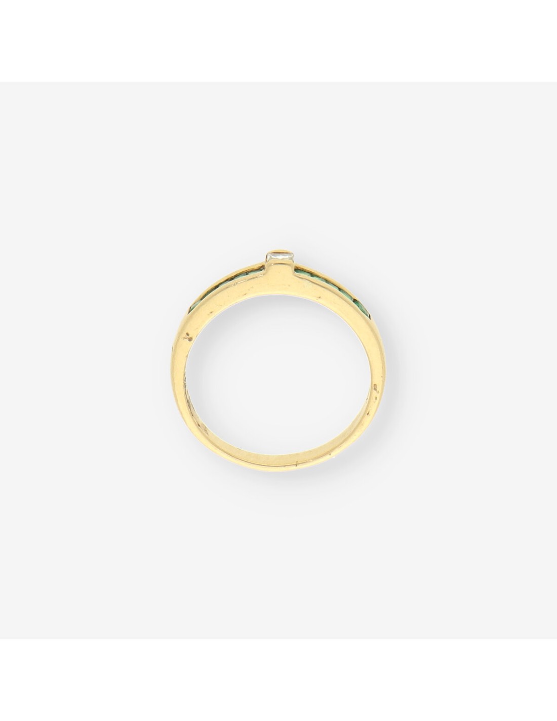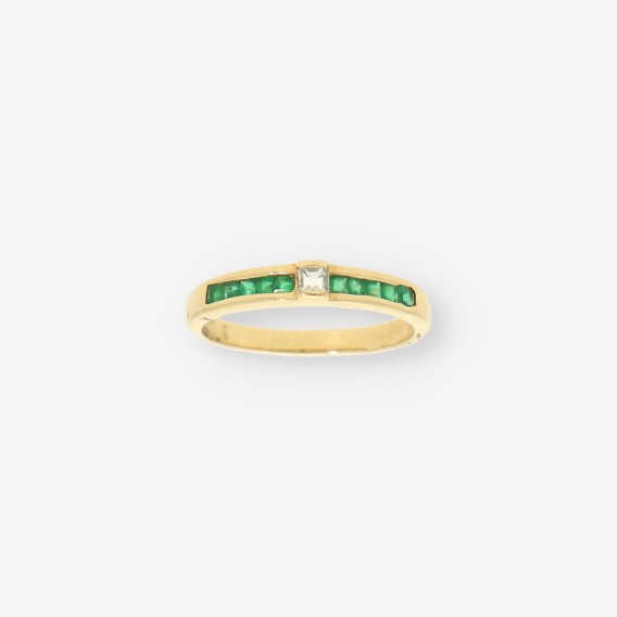 Anillo de segunda mano elaborado en oro amarillo de primera ley, con esmeralda y brillante que realzan su luminosidad. El contraste entre las gemas y el tono cálido del oro crea una composición elegante y equilibrada, propia de la joyería clásica.