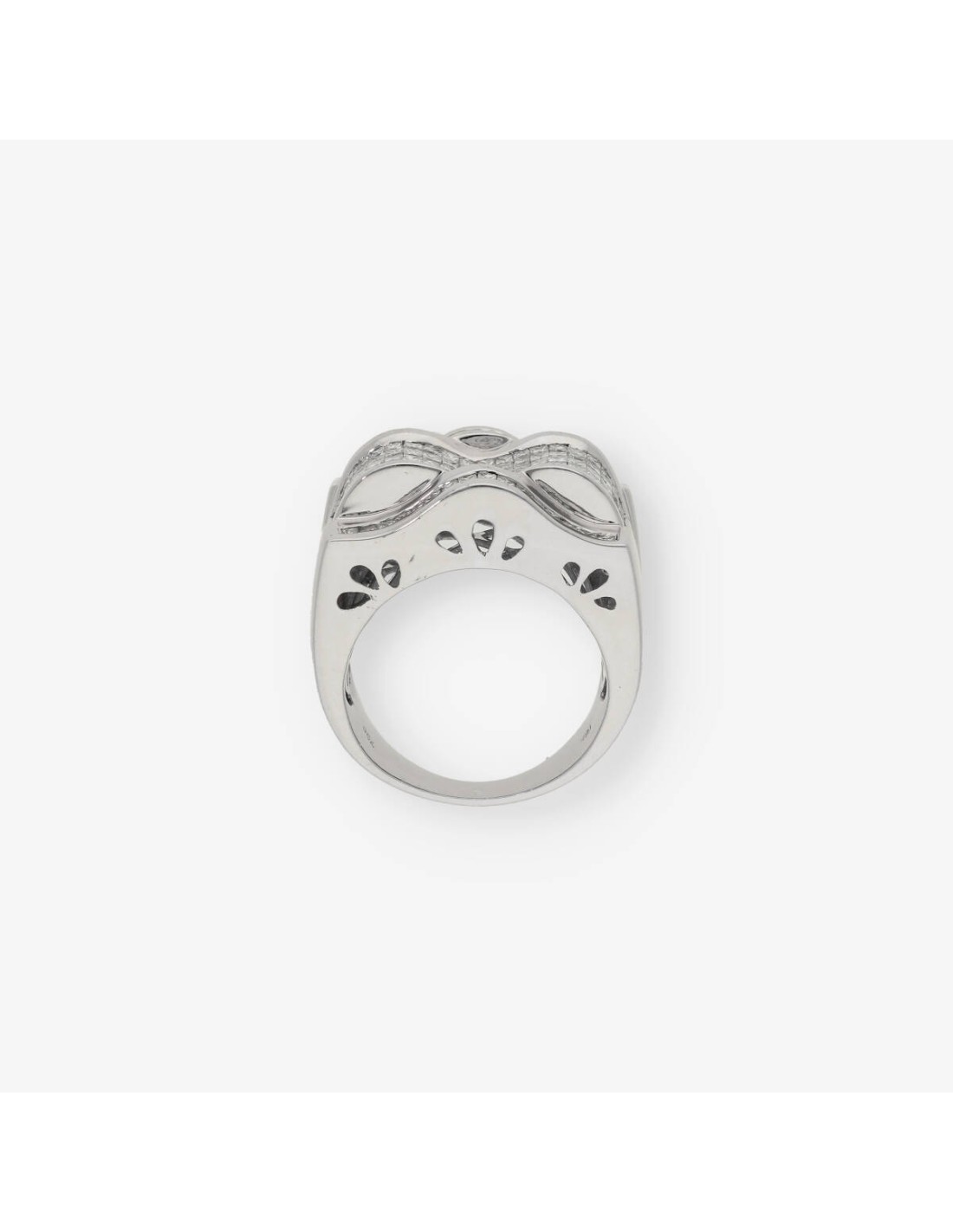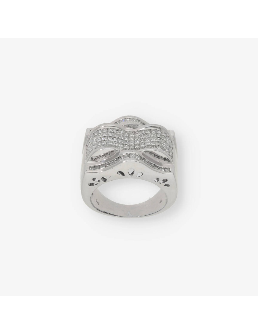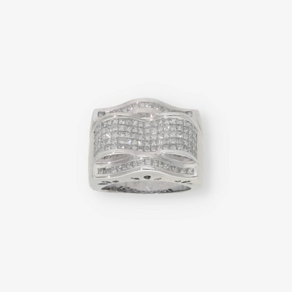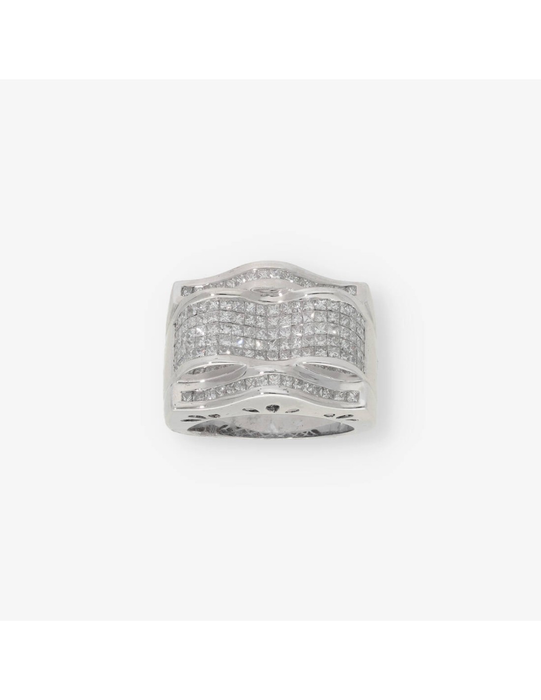 Magnifico anillo ancho de segunda mano en oro blanco de primera ley en perfecto estado de conservación y un espectacular diseño con diamantes en talla pricesa en distintos tamaños. Una pieza ideal para los amantes de las joyas. Talla: 18. Peso: 21.36gr.