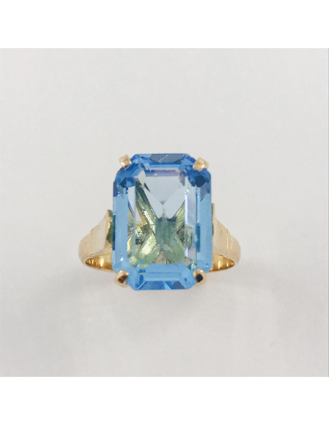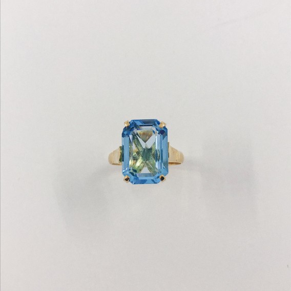 Anillo en oro de 18kt de segunda mano con un lindo topacio azul central. Un regalo perfecto. Peso: 4,7gr. Dedo: 14.