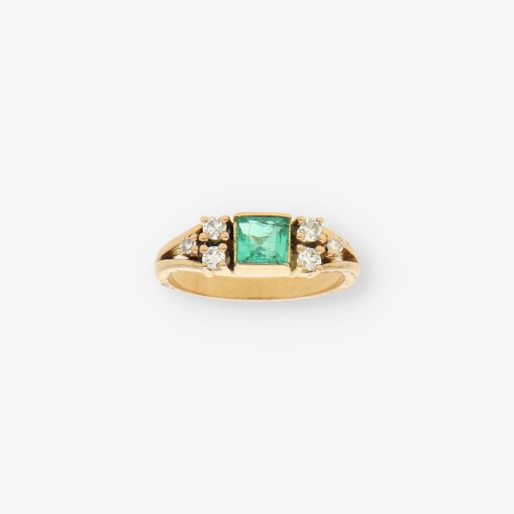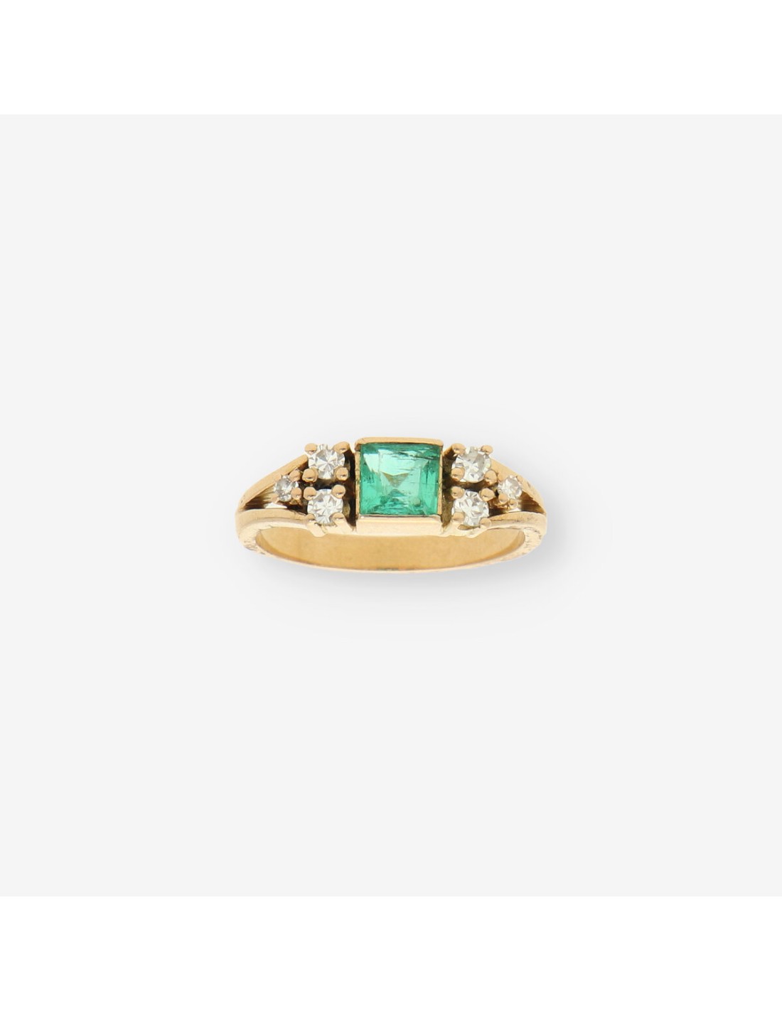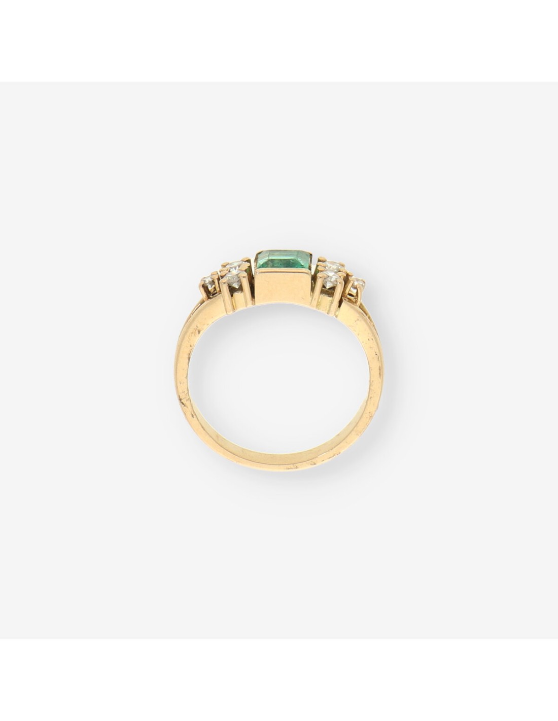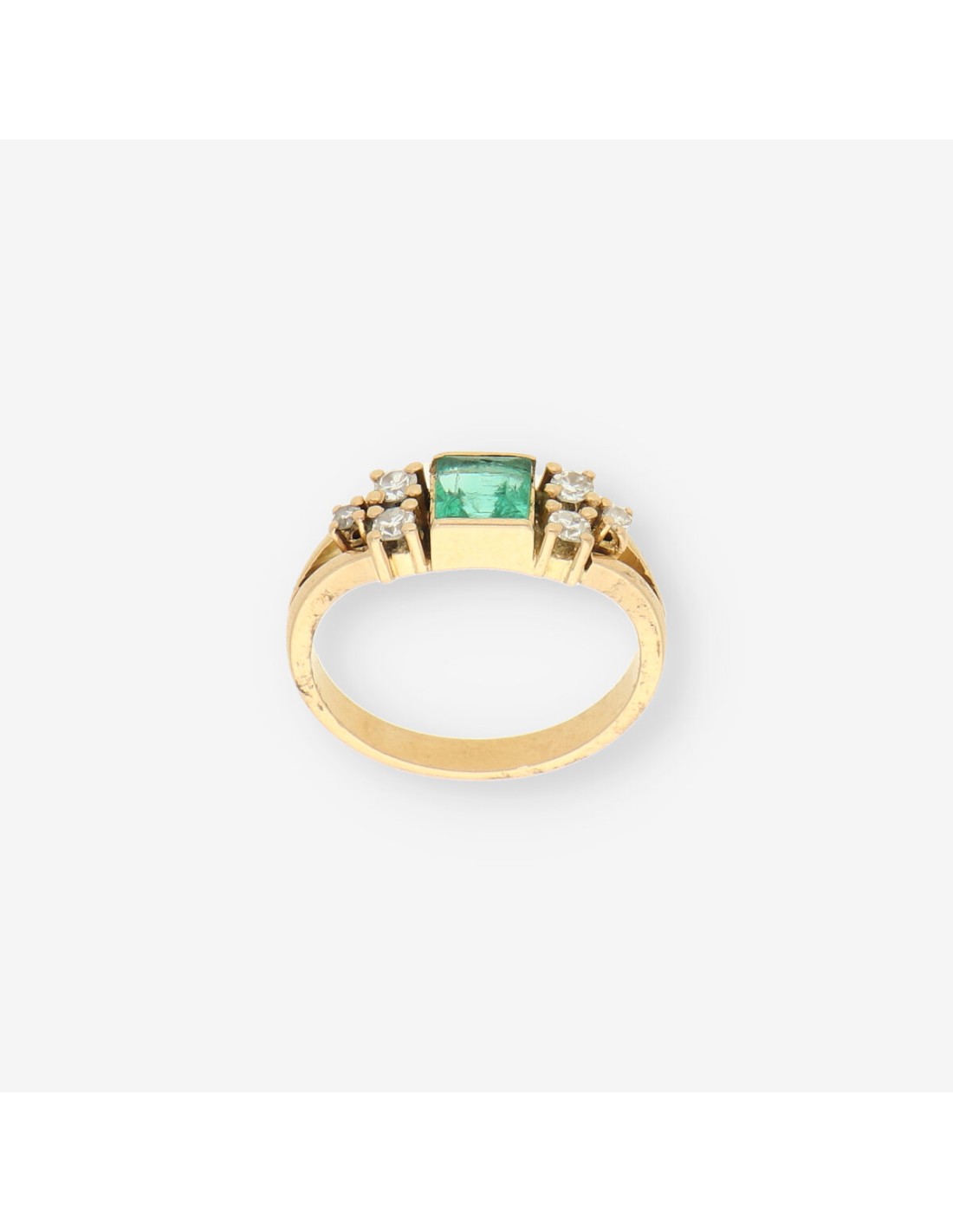 Elegante anillo de segunda mano en oro amarillo de primera ley, engastado con una esmeralda central acompañada de brillantes que aportan un destello adicional. Con un peso de 3,6 gramos y talla 13, es una joya sofisticada y atemporal, perfecta para realzar cualquier ocasión.