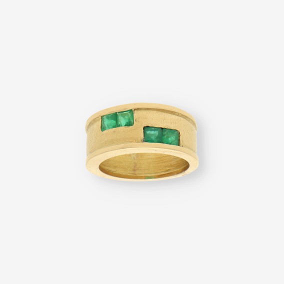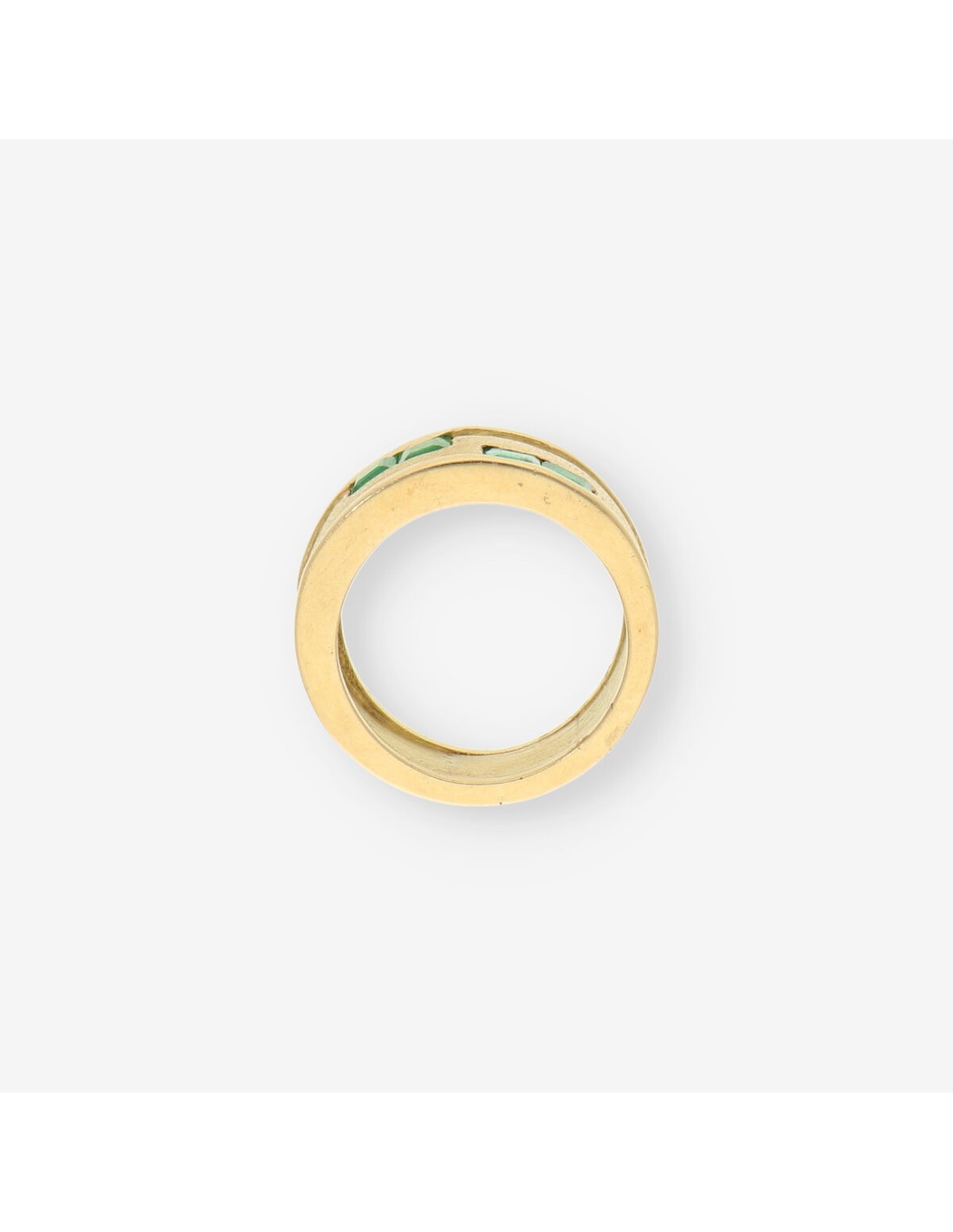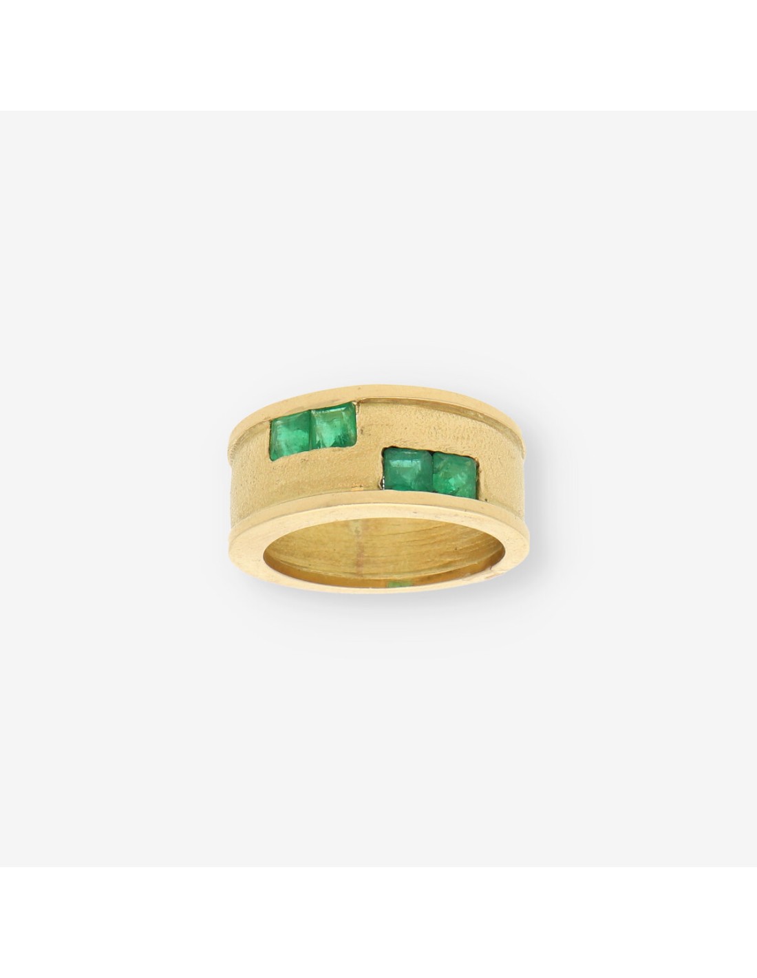 Elegante anillo de segunda mano en oro amarillo de primera ley, engastado con un esmeraldas centrales. Con un peso de 11.8 gramos y talla 14, es una joya distinguida y sofisticada, perfecta para quienes buscan la belleza atemporal de las piedras preciosas en un diseño sólido y refinado.