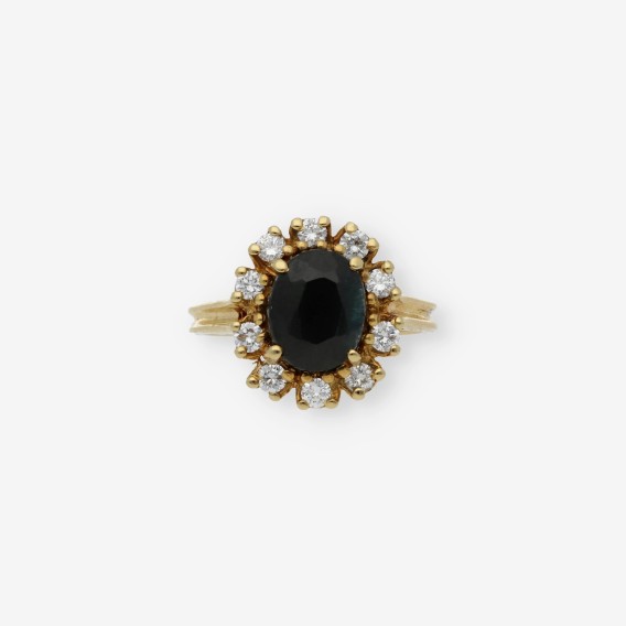 Anillo de segunda mano en oro amarillo de primera ley con piedra central rodeado de brillantes. Talla: 11. Peso: 4.44gr.