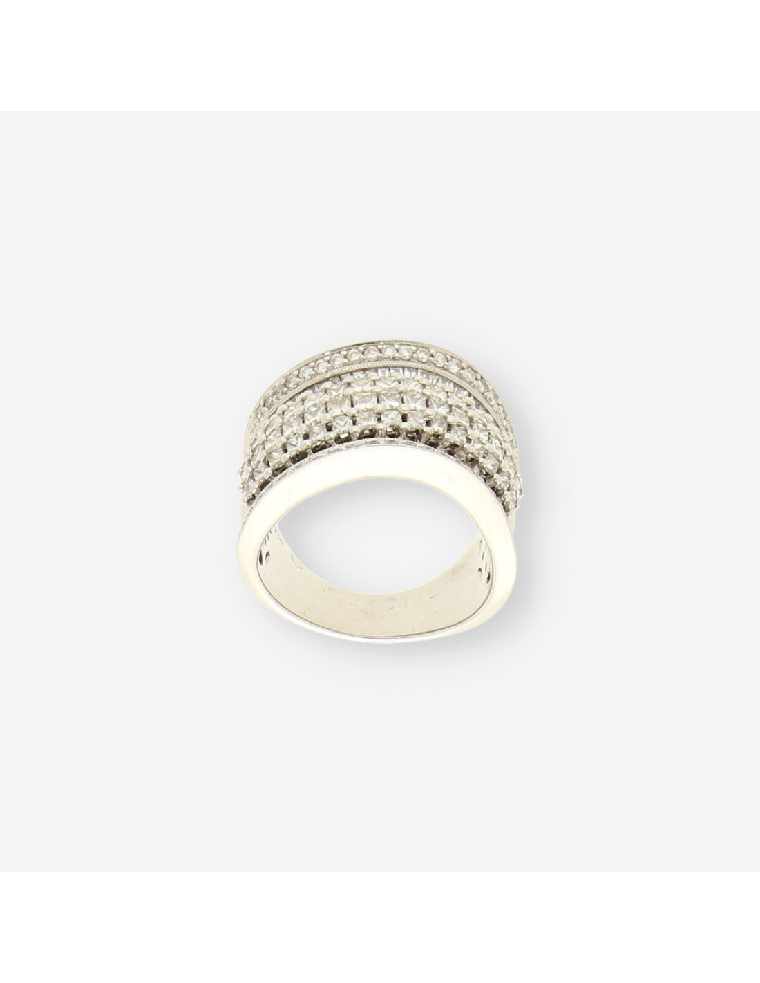 Este distinguido anillo de segunda mano está elaborado en oro blanco de primera ley, con un peso de 13.8 gramos y talla 15. Su diseño presenta múltiples filas de brillantes que aportan un brillo excepcional y sofisticado. La disposición de las piedras crea un efecto deslumbrante, ideal para quienes buscan una pieza que combine lujo y elegancia. Este anillo es perfecto para realzar cualquier ocasión especial con su estilo atemporal y refinado.