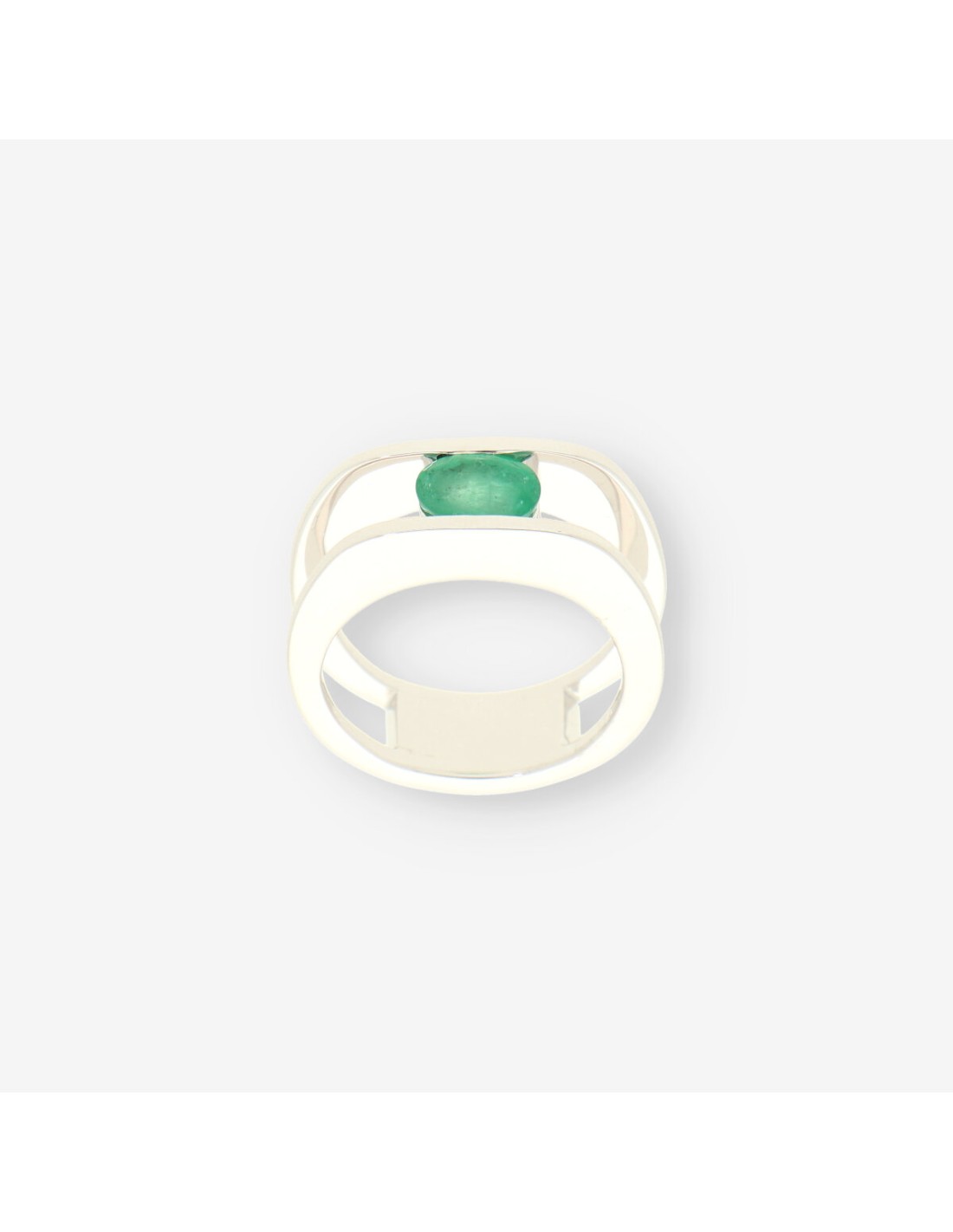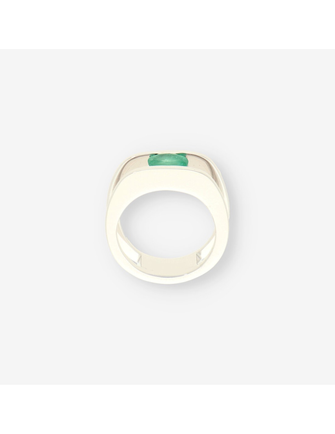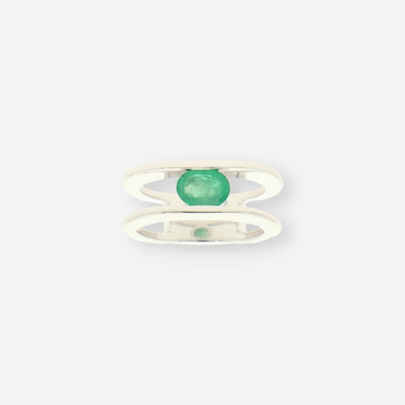 Anillo de segunda mano en oro blanco de primera ley, con un diseño moderno y minimalista engastado con una esmeralda central que resalta por su intenso color verde. Una joya ligera, refinada y sofisticada, perfecta para aportar frescura y distinción en cualquier ocasión. Peso de 13,3 gramos y talla 20.