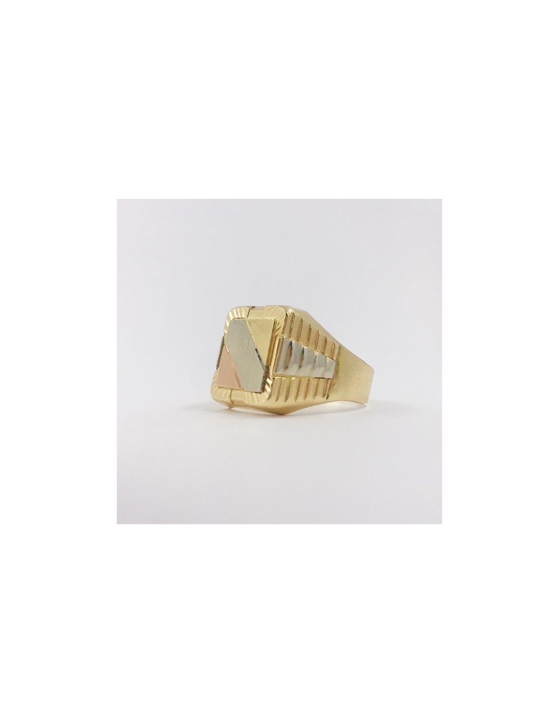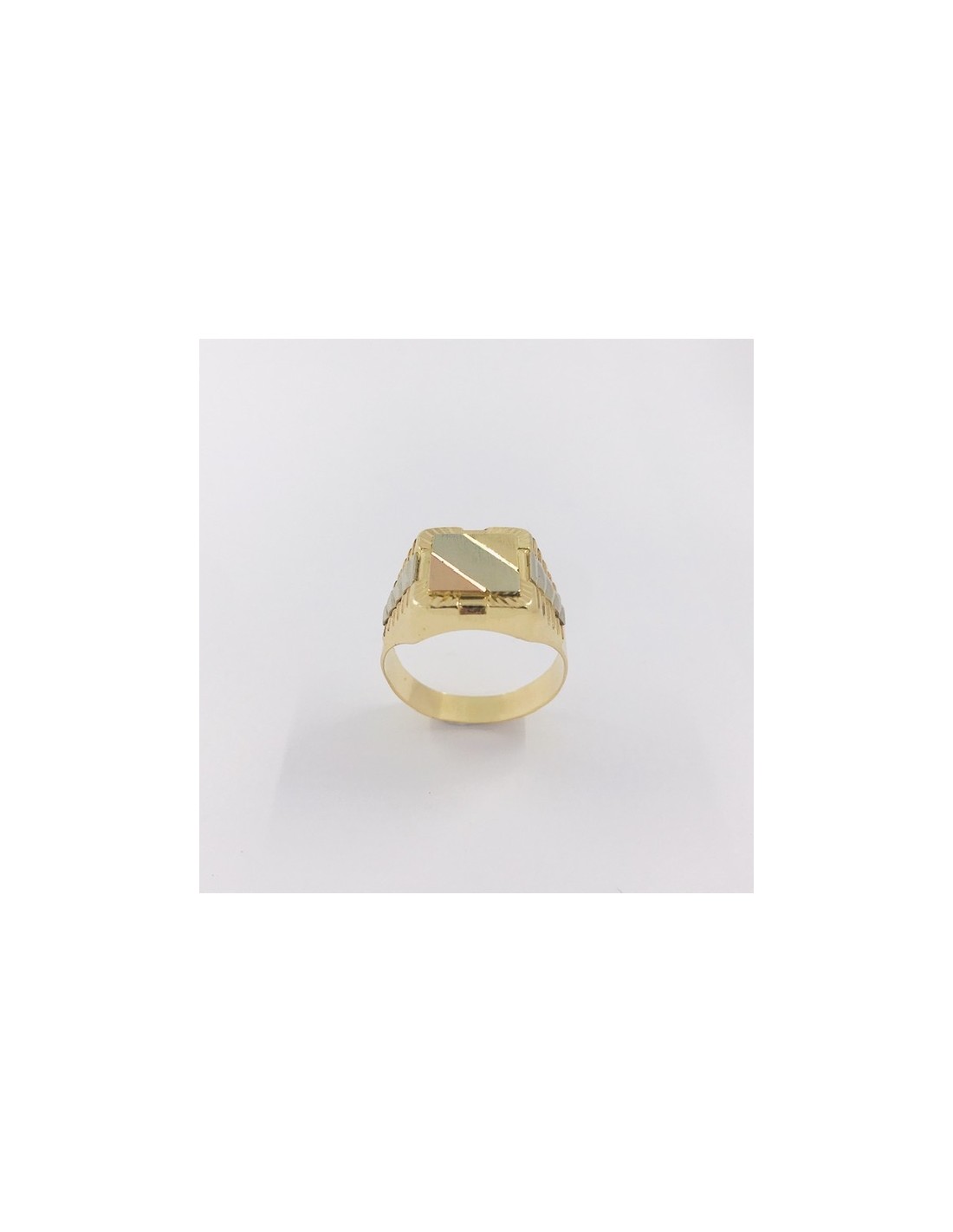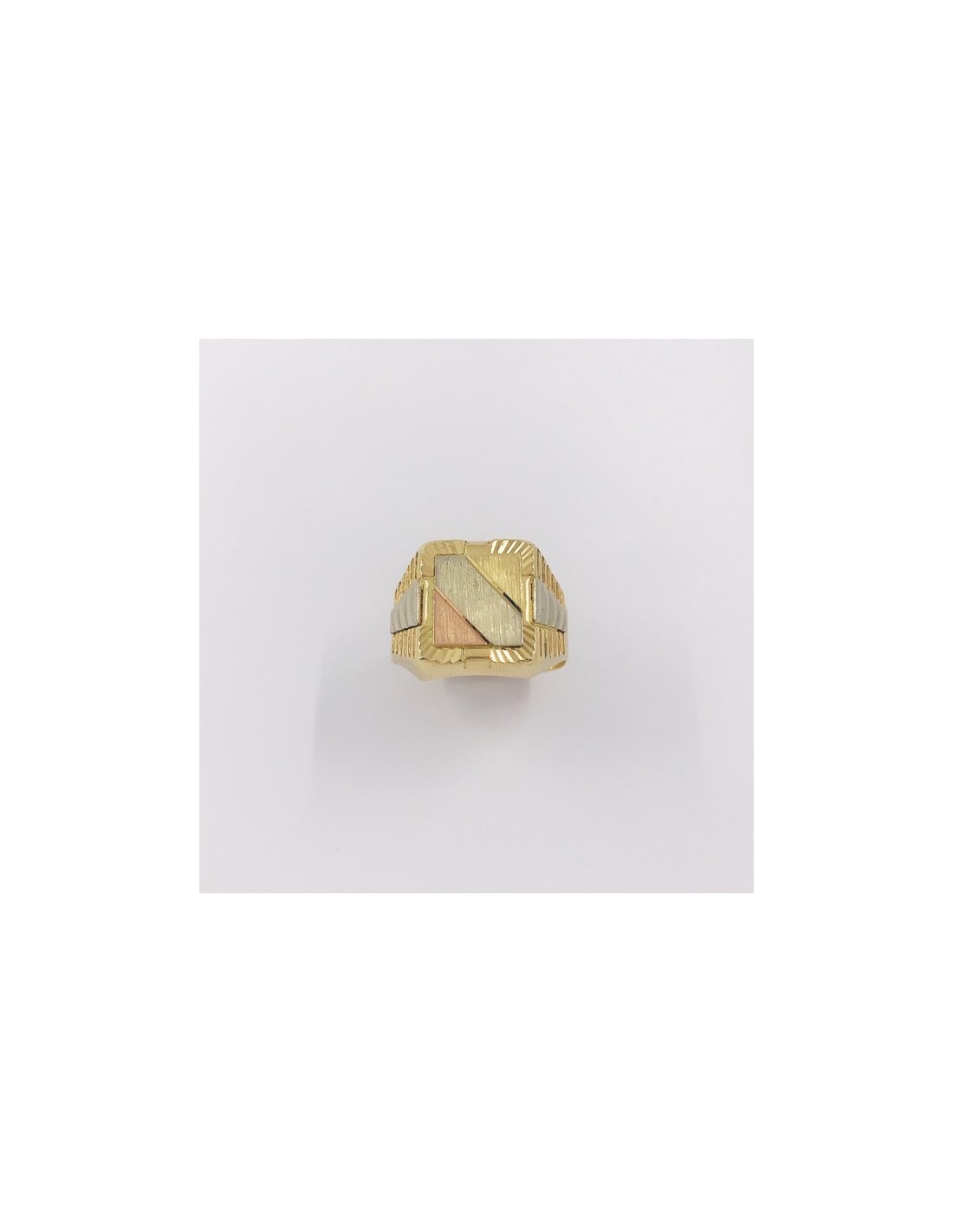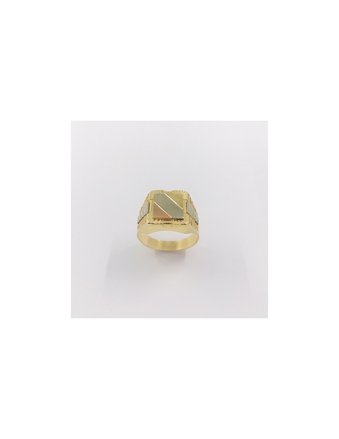 Precioso sello de segunda mano en oro amarillo, rosa y blanco de primera ley. Una magnifica pieza, ideal para los amantes de anillos. Talla: 24. Peso: 7.5gr.