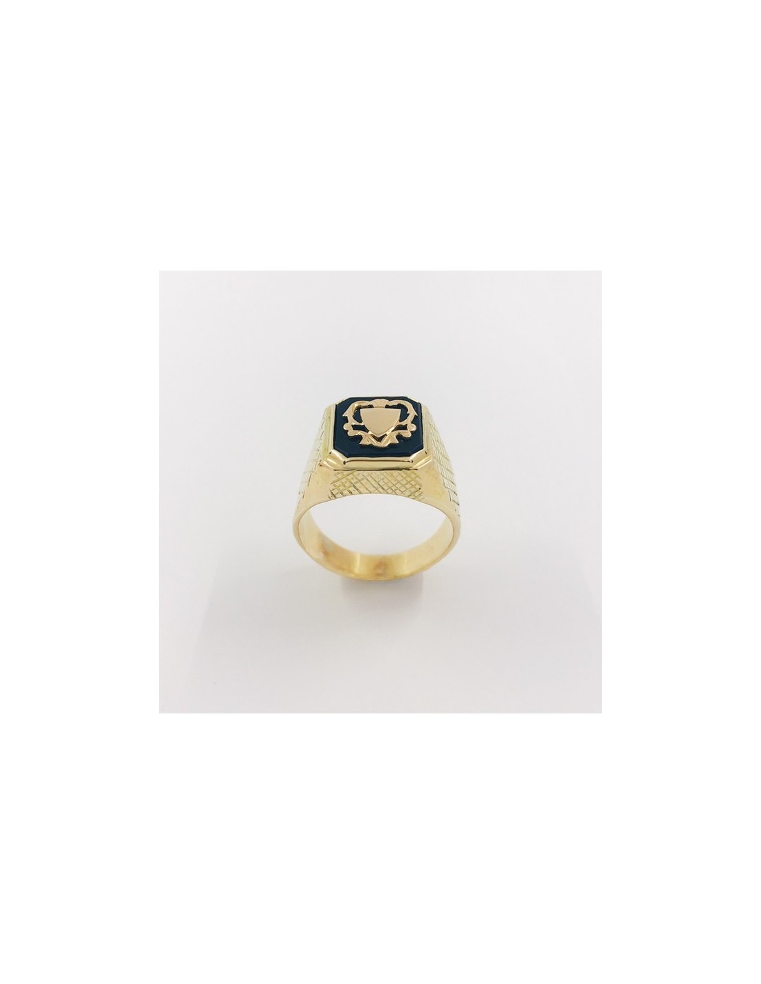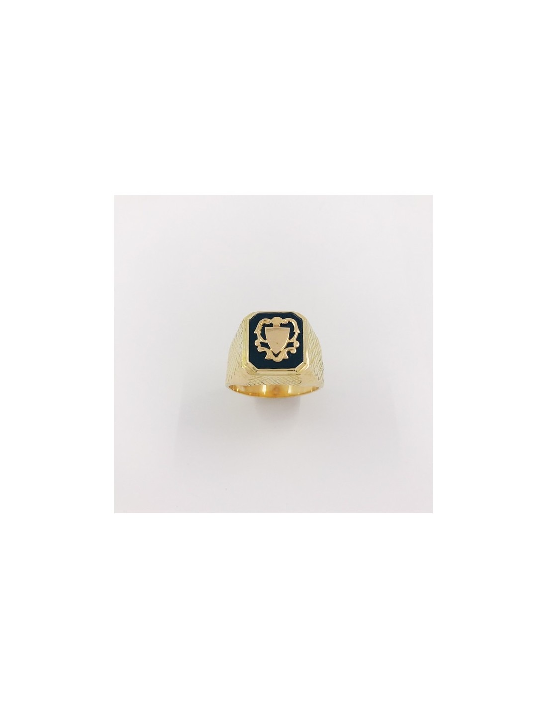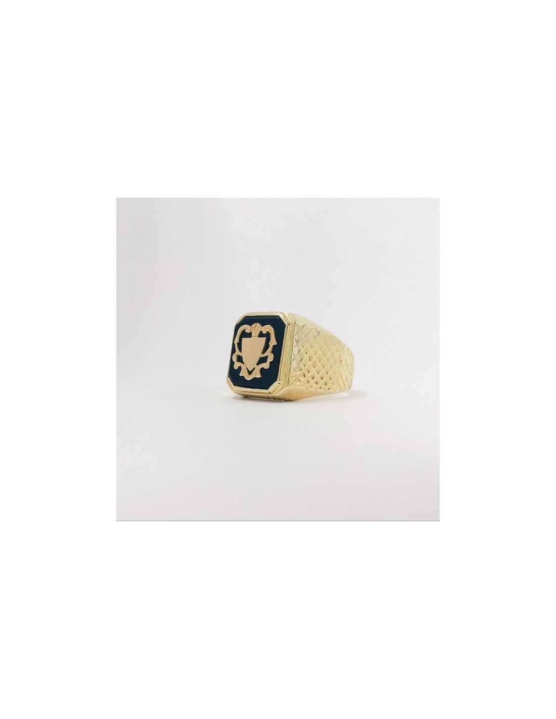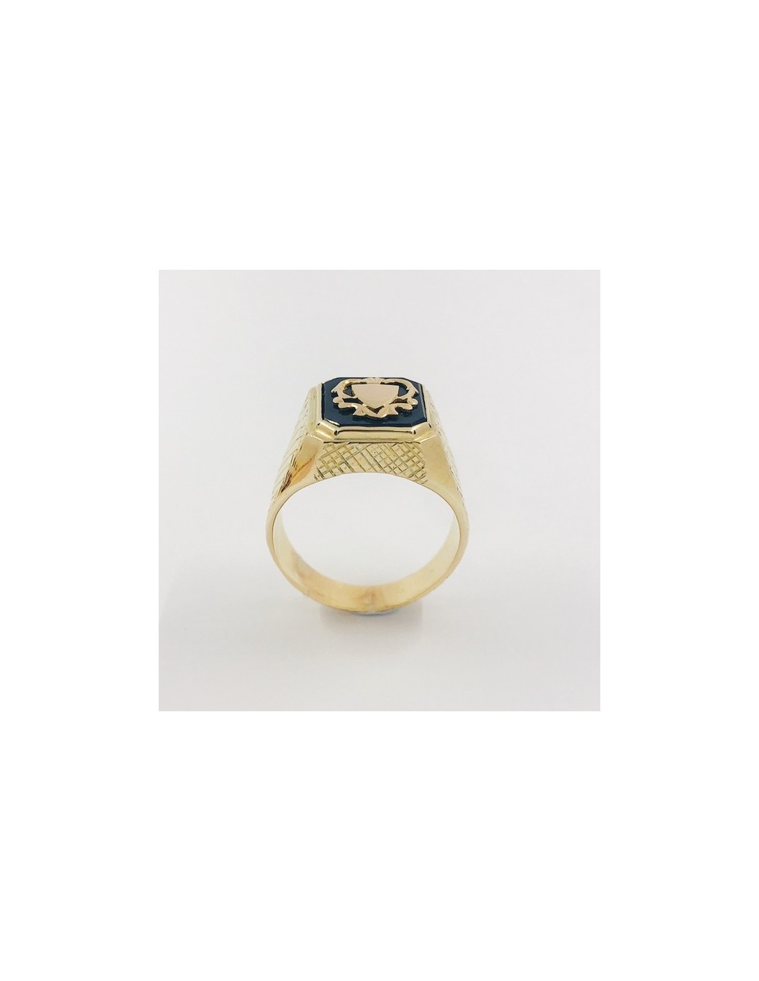 Precioso anillo en sello de segunda mano en oro amarillo de primera ley con ónix y escudo central. Una pieza clásica, ideal para los amantes de los sellos. Talla: 21. Peso: 13,6gr.