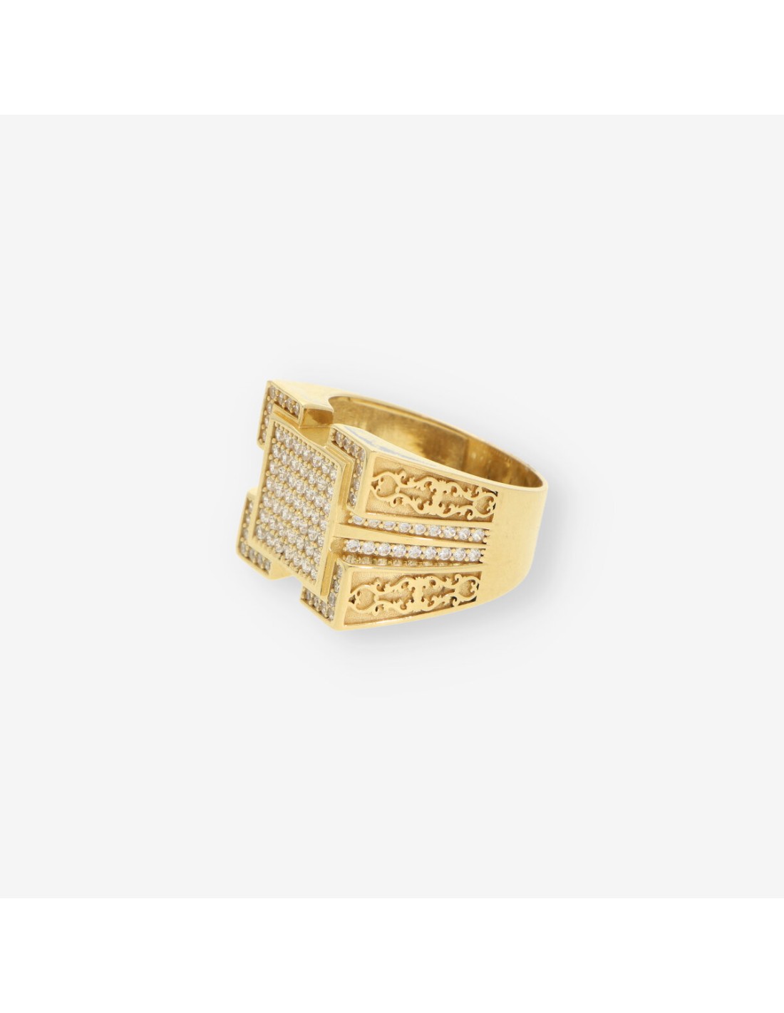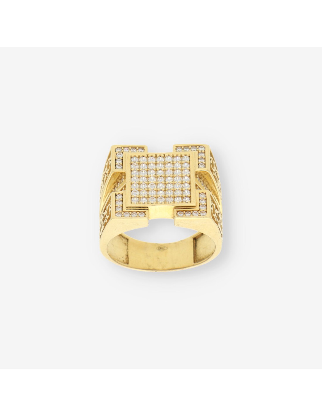 Anillo sello cuadrado en oro de 18 kt con circonitas engastadas. Diseño robusto y elegante, ideal como pieza distintiva. Talla 26 y peso de 12,5 g.
