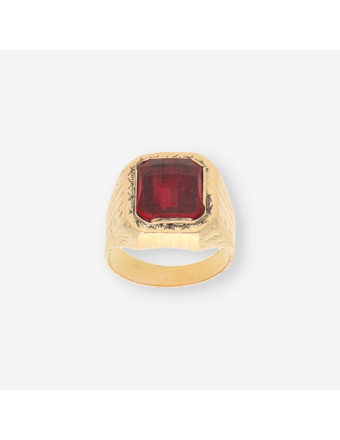 Anillo sello en oro de primera ley con una vibrante piedra roja. Pesa 7.4 gramos, ofreciendo una combinación robusta de estilo y durabilidad. Perfecto para destacar con elegancia en cualquier ocasión.