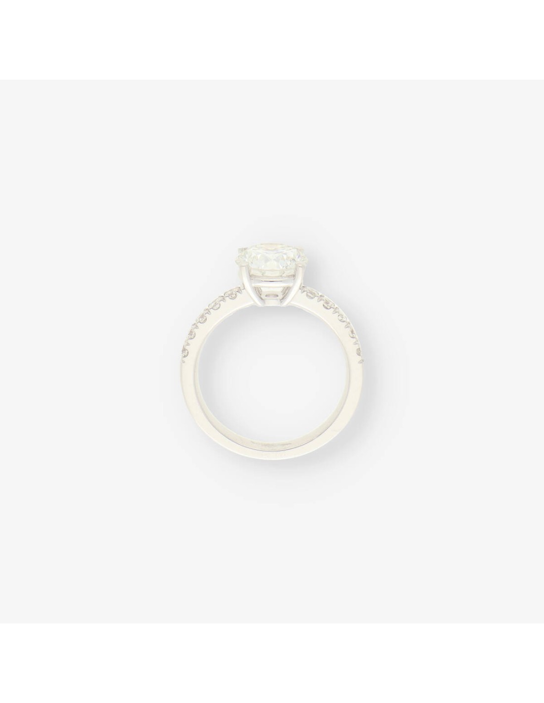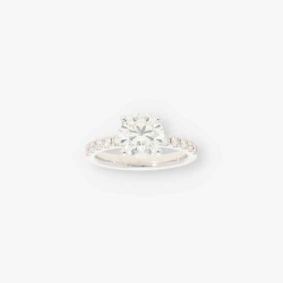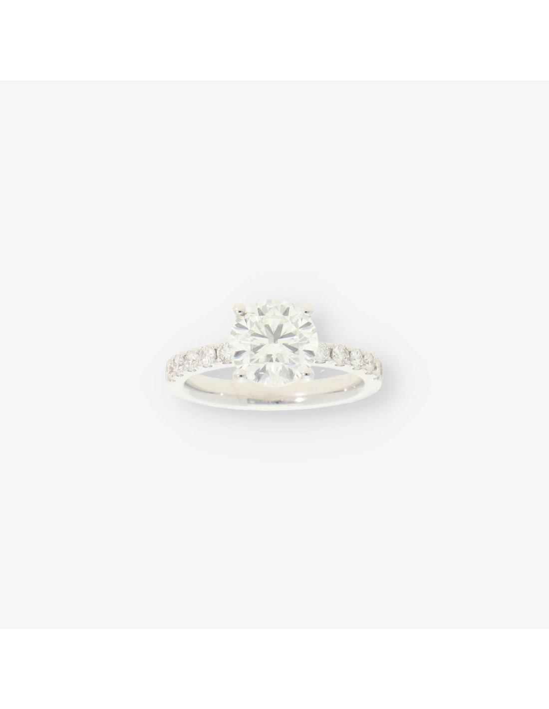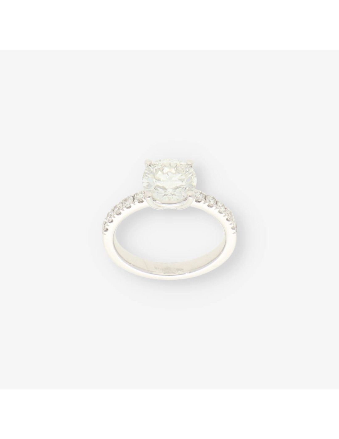 Anillo en oro blanco de primera ley con diamante central en talla brillantes 2.3qt (2.7qt total) aproximado. Talla: 14. Peso: 4.86gr.