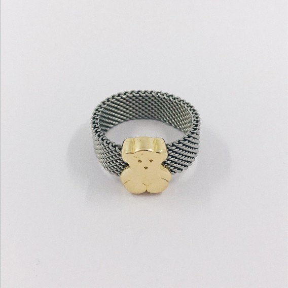 Precioso anillo Tous de segunda mano en malla de acero y oro amarillo de primera ley. Con un diseño clásico de la gran firma Tous éste es una pieza para ser llevada. Talla: 16. Peso: 4,5gr.