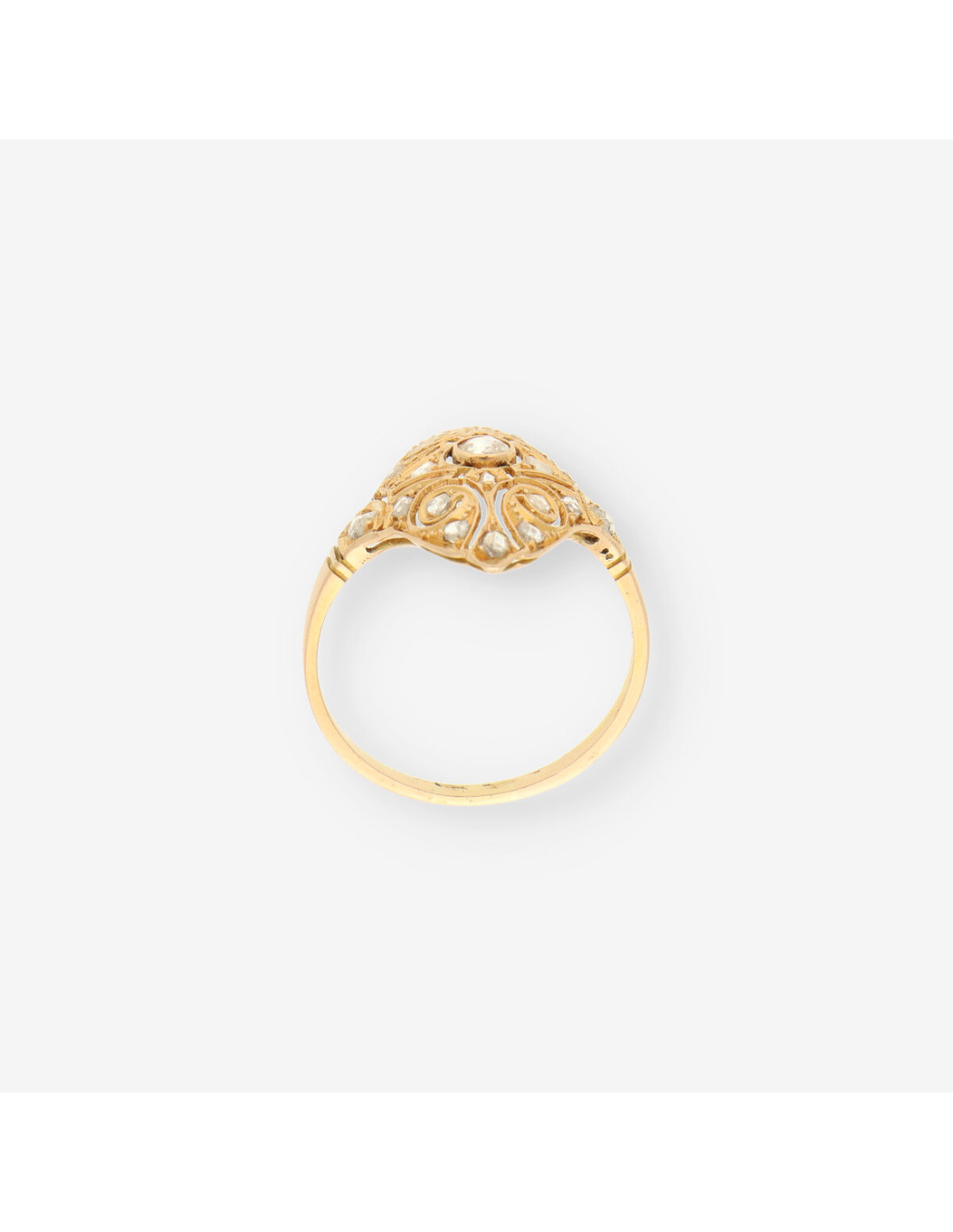 Este elegante anillo de segunda mano, elaborado en oro amarillo de primera ley, está adornado con exquisitos diamantes que realzan su diseño sofisticado. Con un peso de 2.7 gramos y una talla 19, esta joya vintage destaca por su intrincado trabajo en filigrana, evocando la elegancia de épocas pasadas. Es una pieza perfecta para quienes buscan un complemento distintivo y atemporal, capaz de aportar un toque de sofisticación a cualquier ocasión.