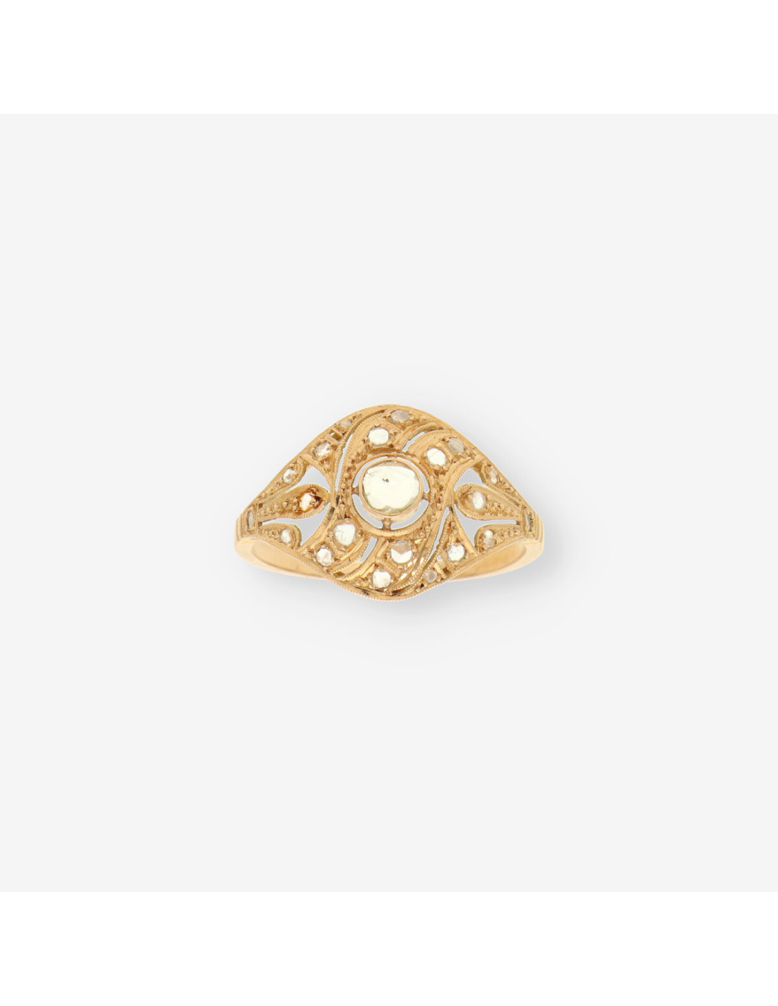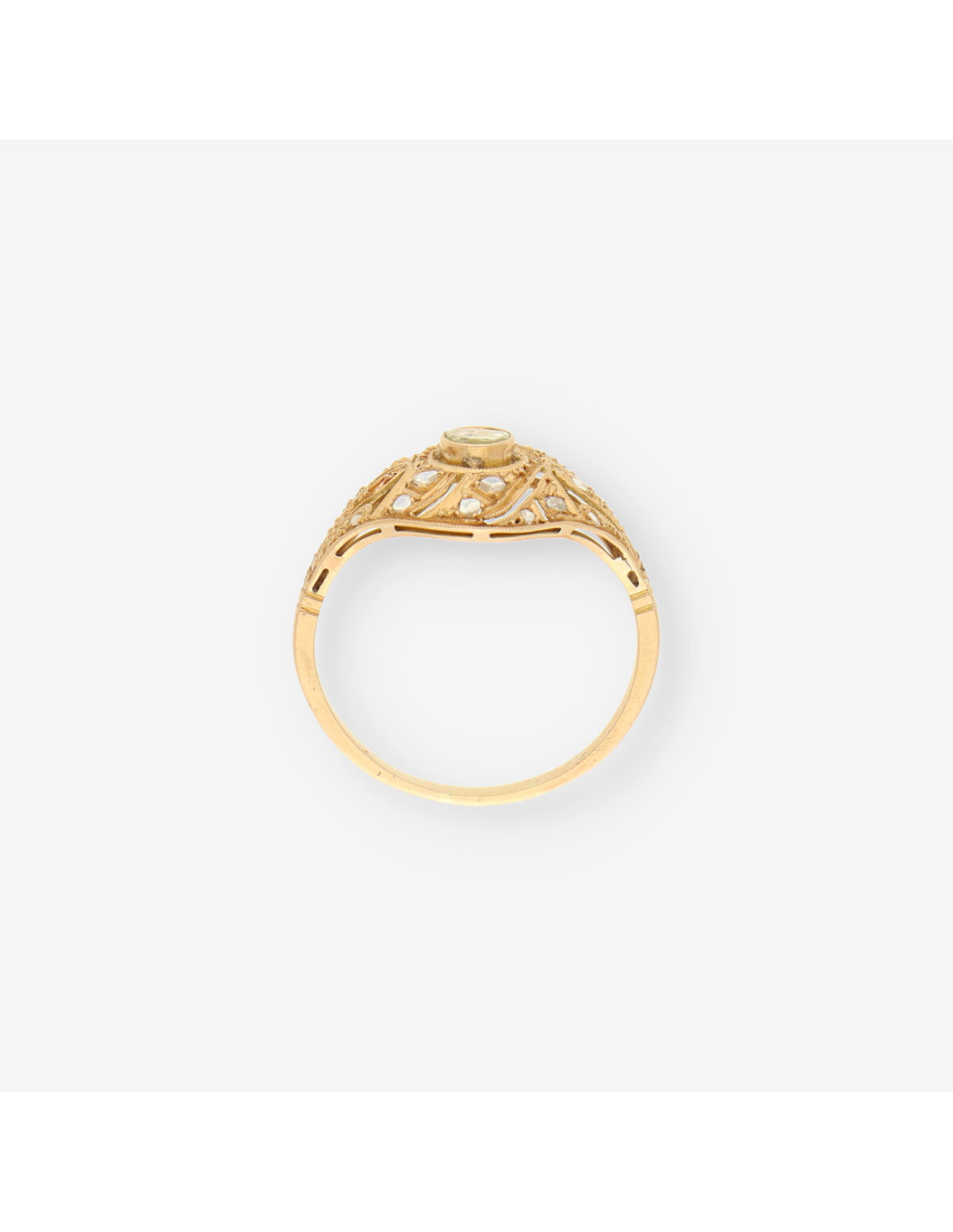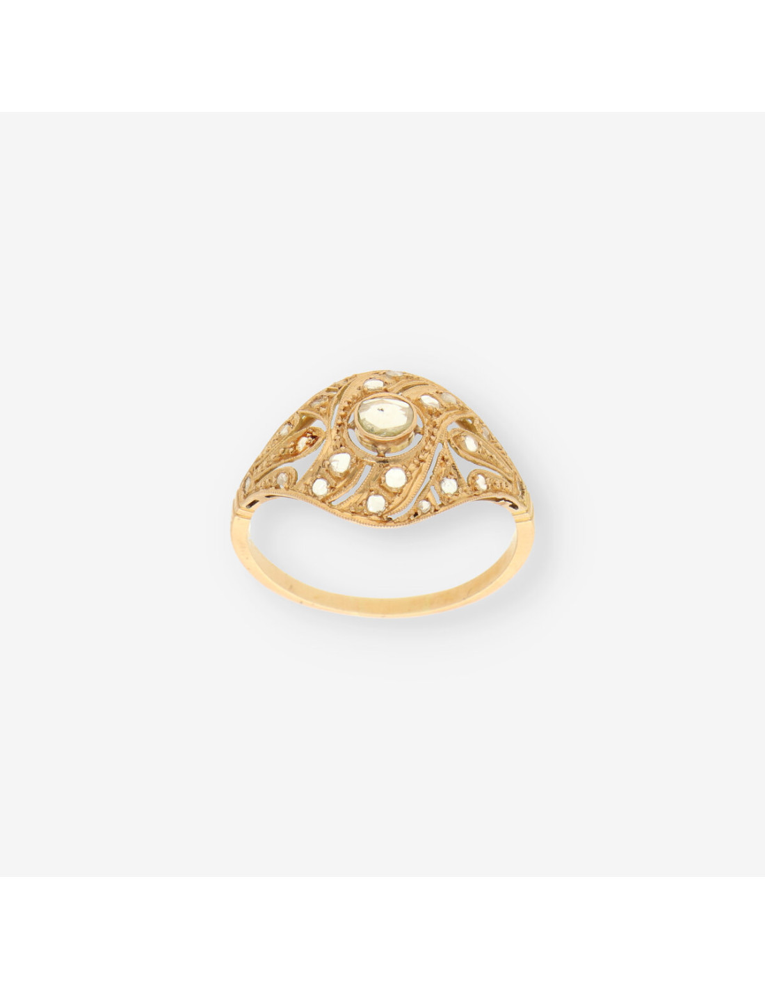 Este delicado anillo de segunda mano, confeccionado en oro amarillo de primera ley, está adornado con diamantes que aportan un brillo sutil y elegante. Con un peso de 2.1 gramos y una talla 17, su diseño vintage presenta un intrincado trabajo de filigrana que evoca la sofisticación de épocas pasadas. Es una pieza ideal para quienes buscan un toque de distinción y estilo clásico en su joyería, perfecto para realzar cualquier atuendo con elegancia.