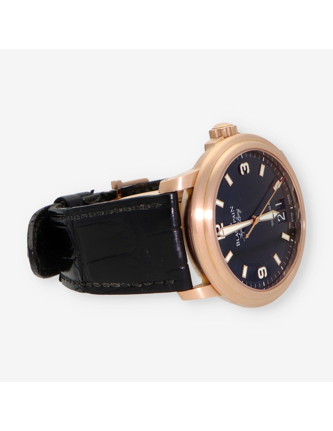 Magnífico reloj Blancpain Aqua Lung Grand Date de segunda mano en perfecto estado de marcha y conservación. Ref. 2850B-3630A-64B. Con movimiento automático, caja en oro rosa de primera ley, crista zafiro, fondo negro, sin cifras con resistencia al agua de 10 atmósferas. Correa de piel en color negro con cierre de broche plegable en oro rosa.