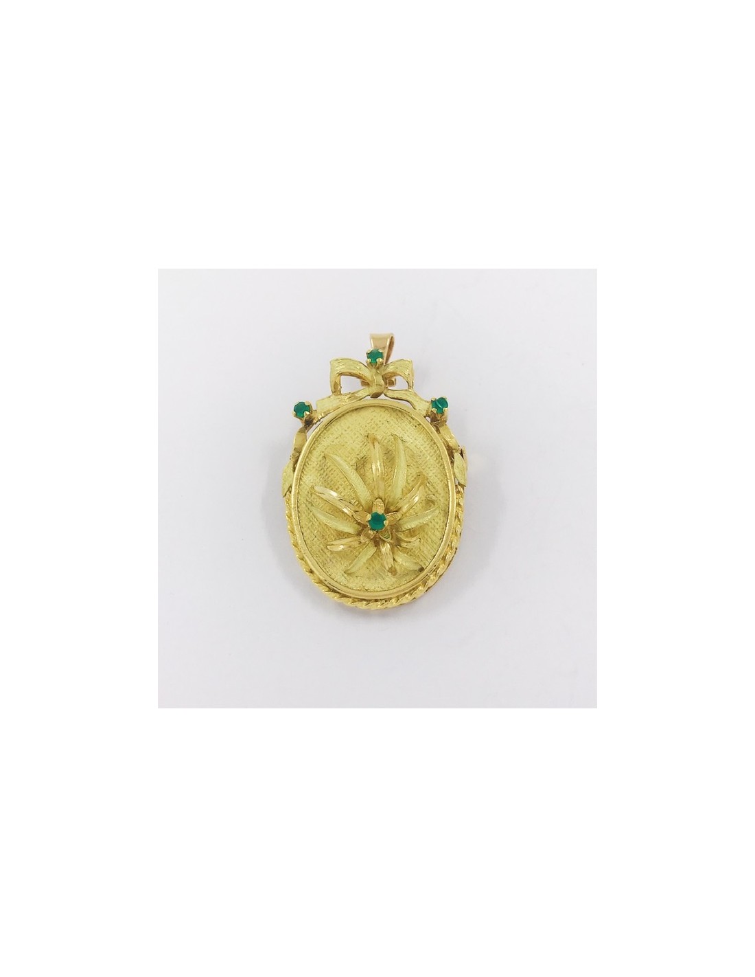 Broche colgante de segunda mano en oro de 18 kt. y piedras de color. Medidas: 3,5 x 2,5 cm. Peso: 8,8 gr.