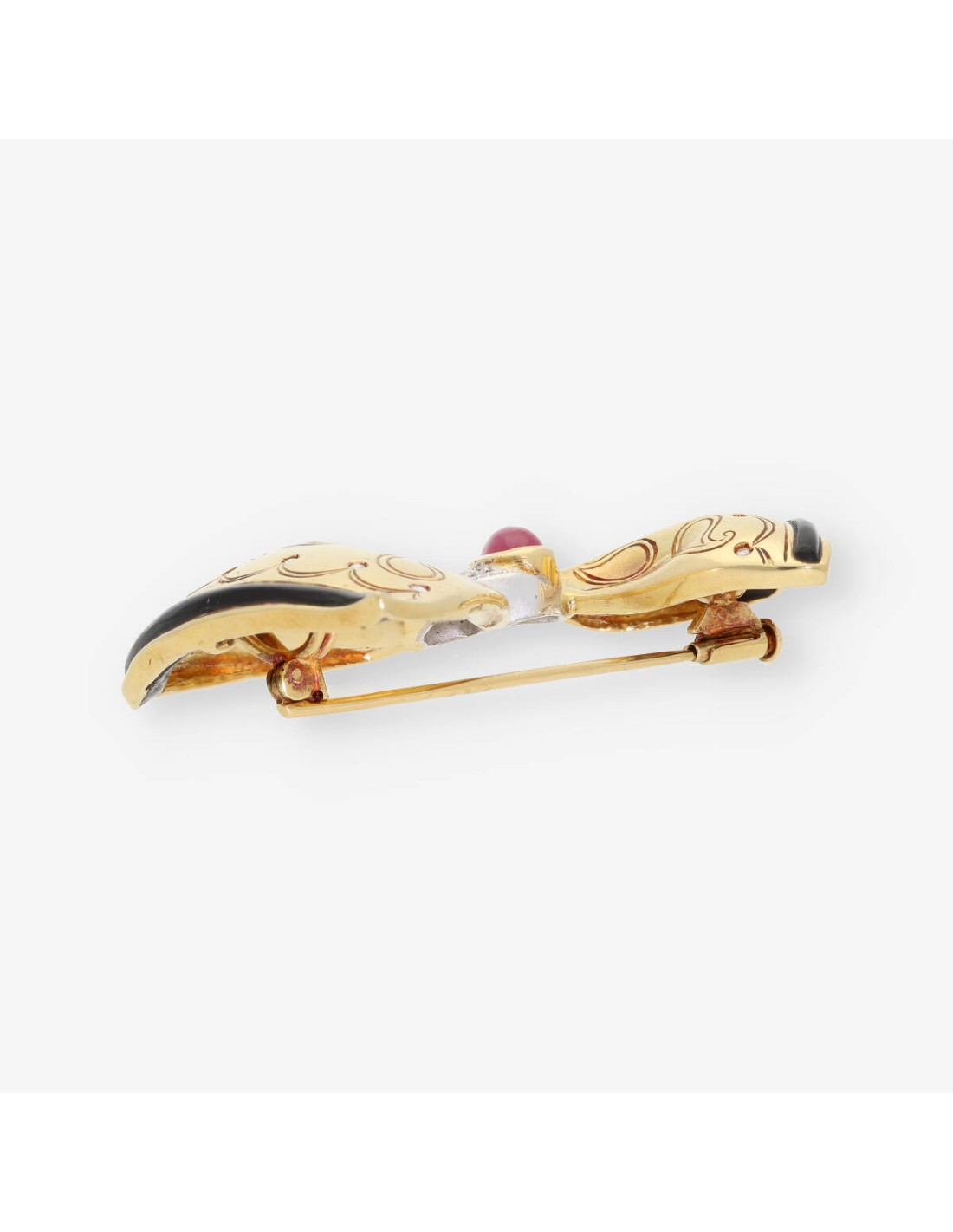 Precioso broche de segunda mano en oro amarillo de primera ley con diamantes. Medidas: 6.3cm. X 3.4cm. Peso: 23.9gr.