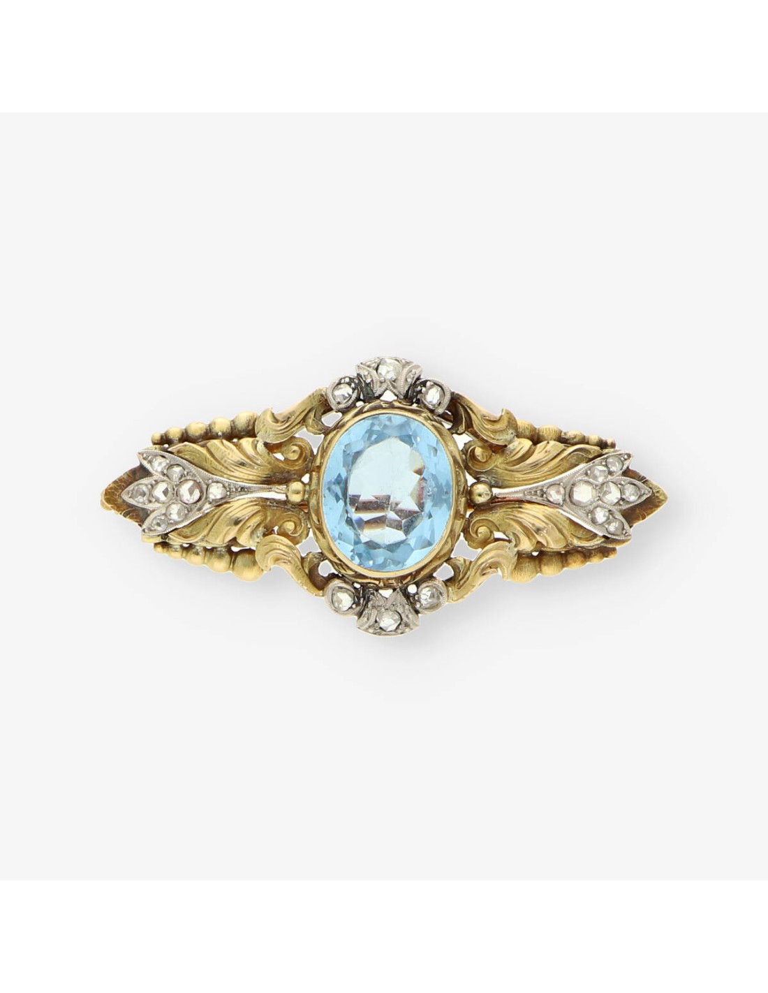 Precioso broche de segunda mano en oro amarillo de primera ley con diamantes. Medidas: 5.5cm. X 2.5cm. Peso: 16.1gr.
