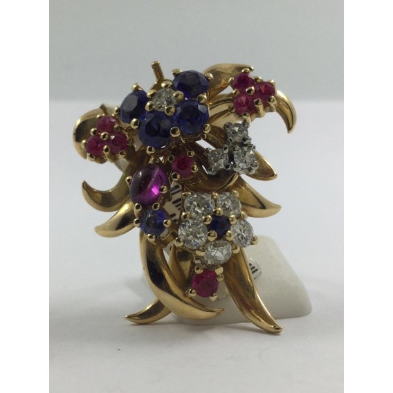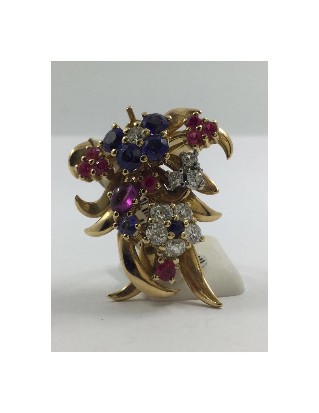 Broche de ocasión en oro de 18 kt. con brillantes y piedras de color. Medidas: 3,2 x 2,5 cm. Peso: 14 gr.