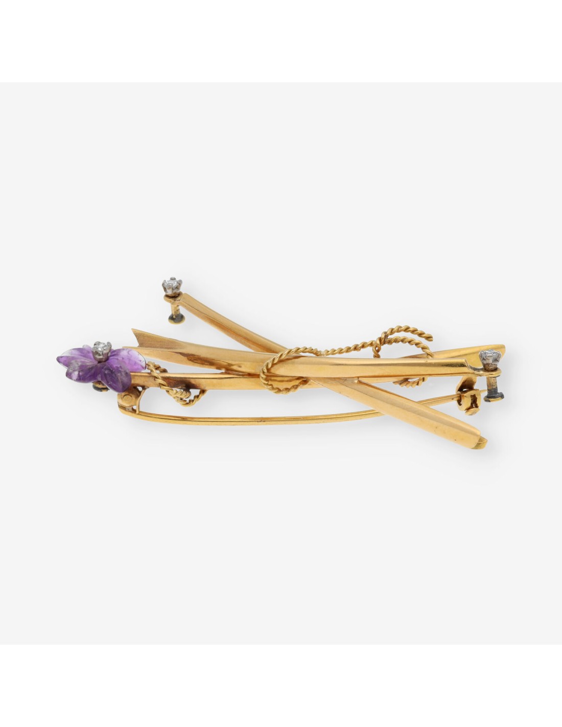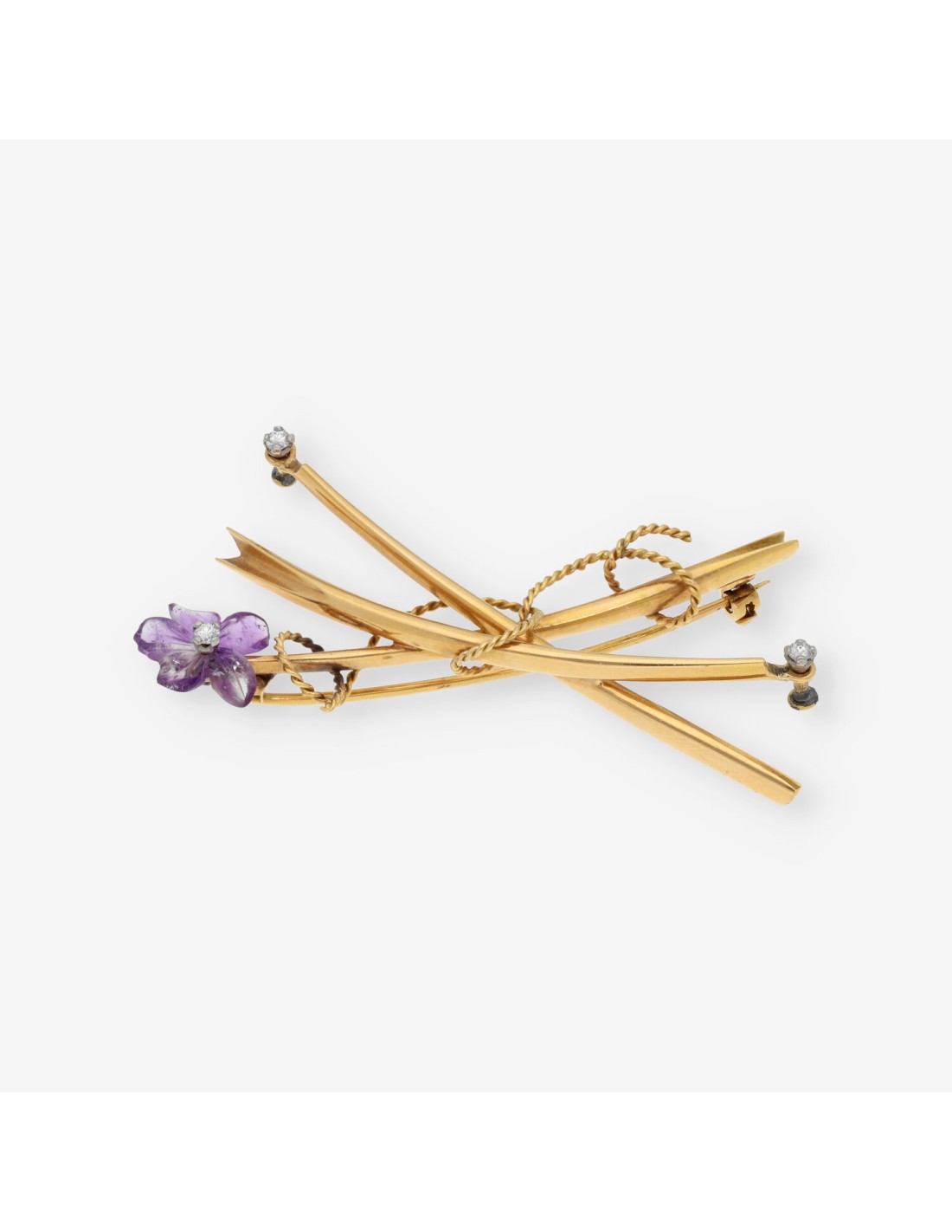Broche de ocasión en oro de 18 kt. con brillantes y piedras de color. Medidas: 6 x 3 cm. Peso: 14,6 gr.
