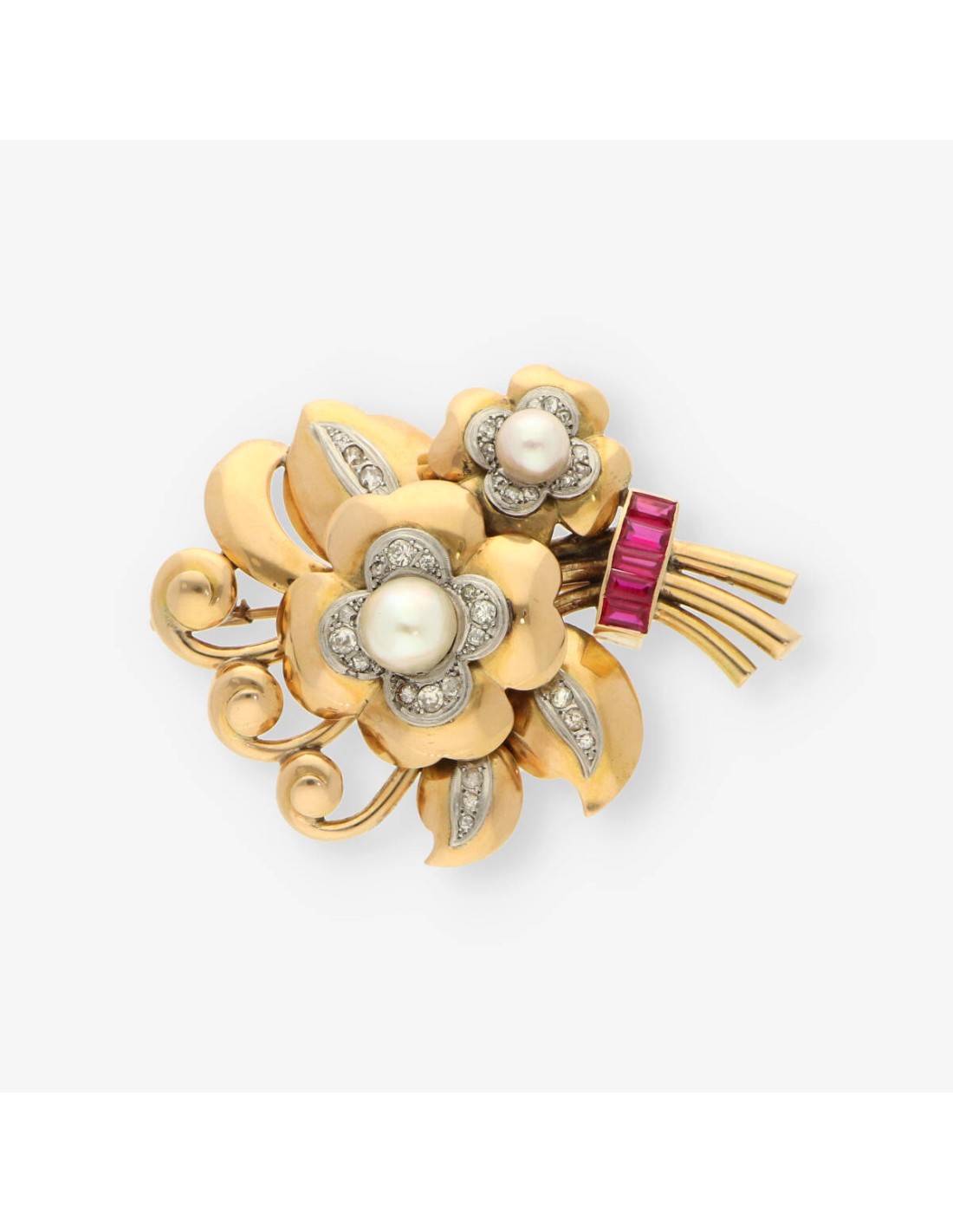 Precioso broche de segunda mano en oro amarillo de primera ley con diamantes y perlas centrales. Alto: 6.5cm. Ancho: 5.1cm. Peso: 36.3gr.