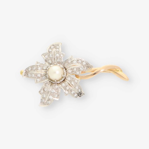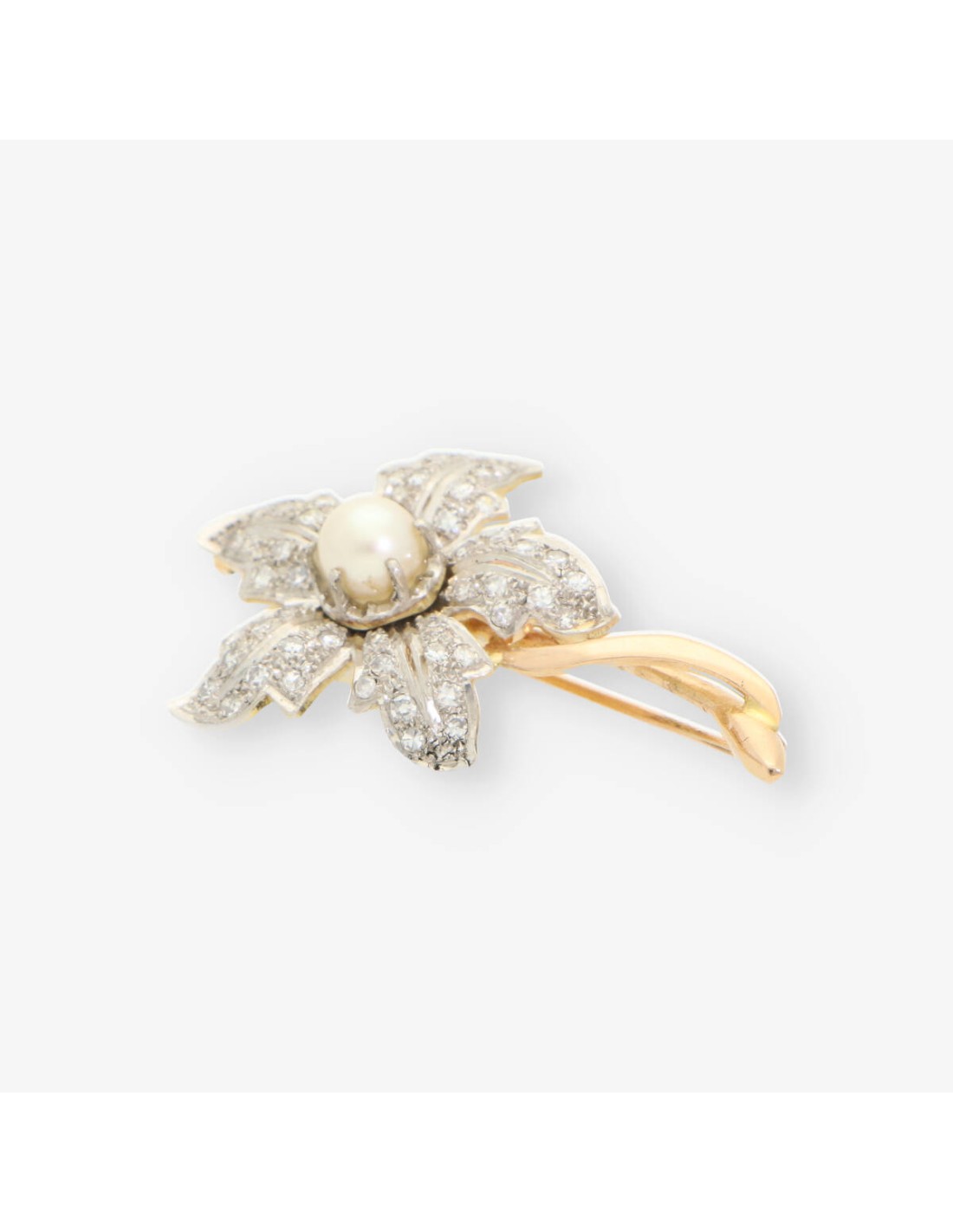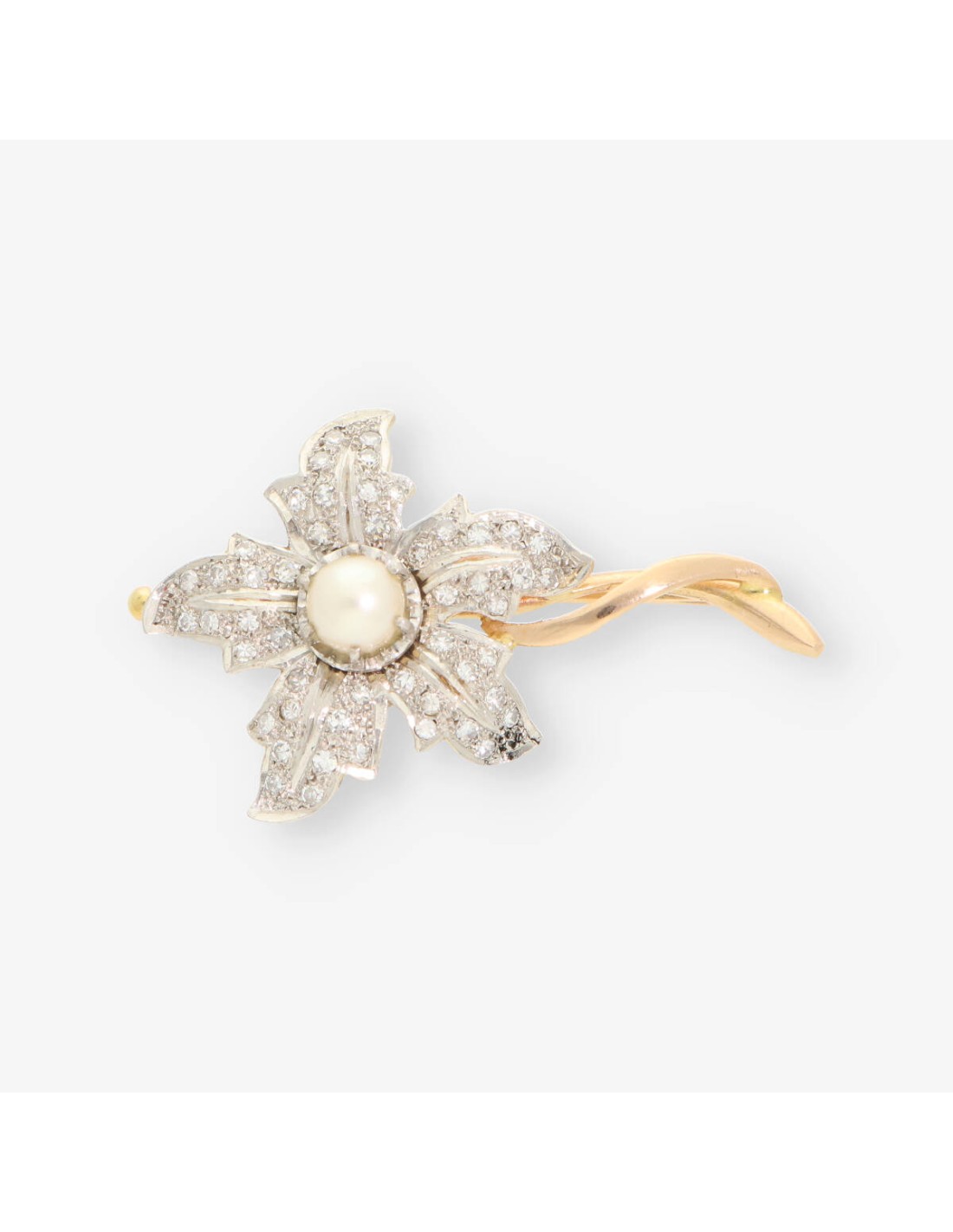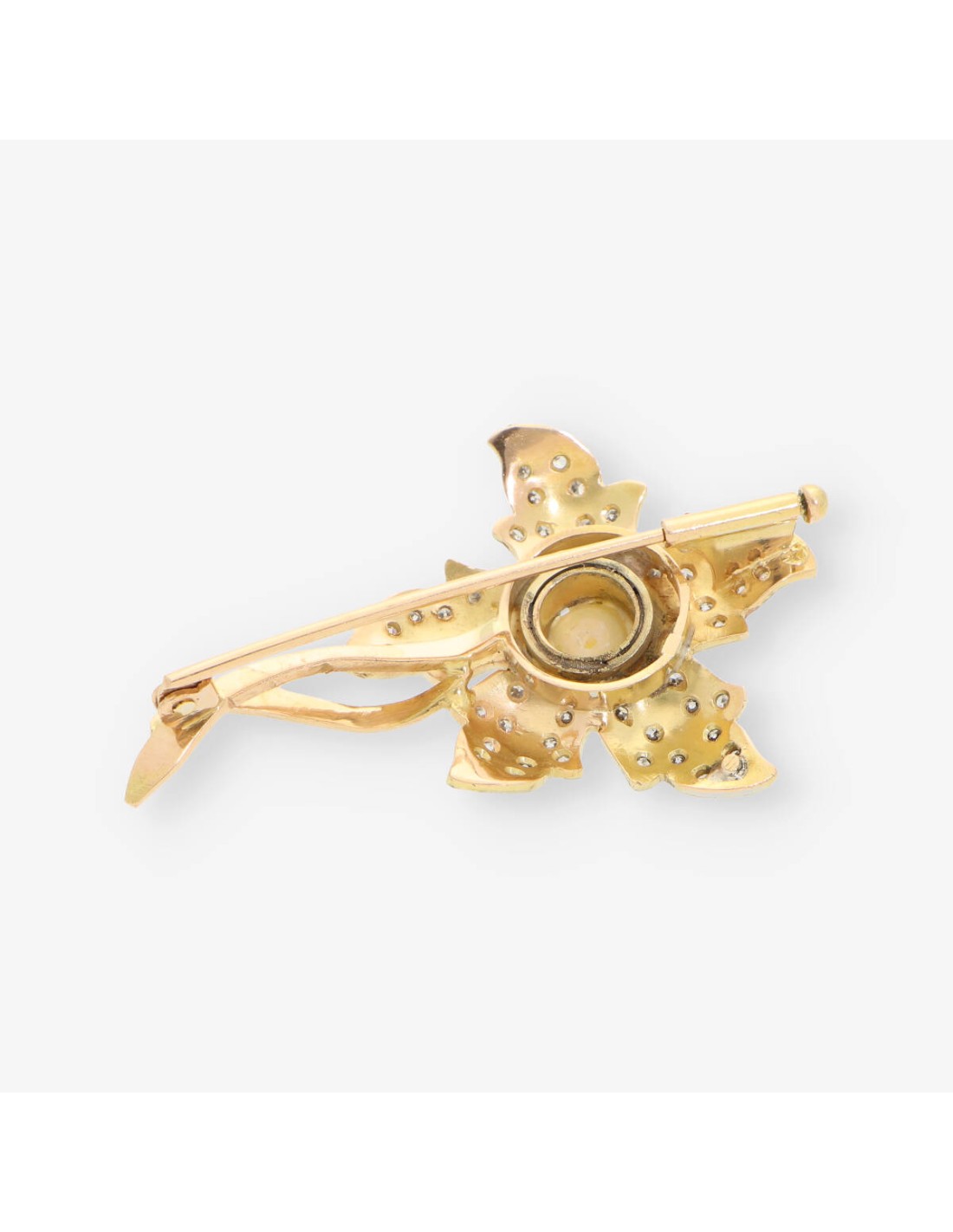 Precioso broche de segunda mano en oro amarillo de primera ley con esmeraldas y brillantes centrales. Alto: 4.8cm. Ancho: 3cm. Peso: 11.1gr.