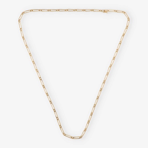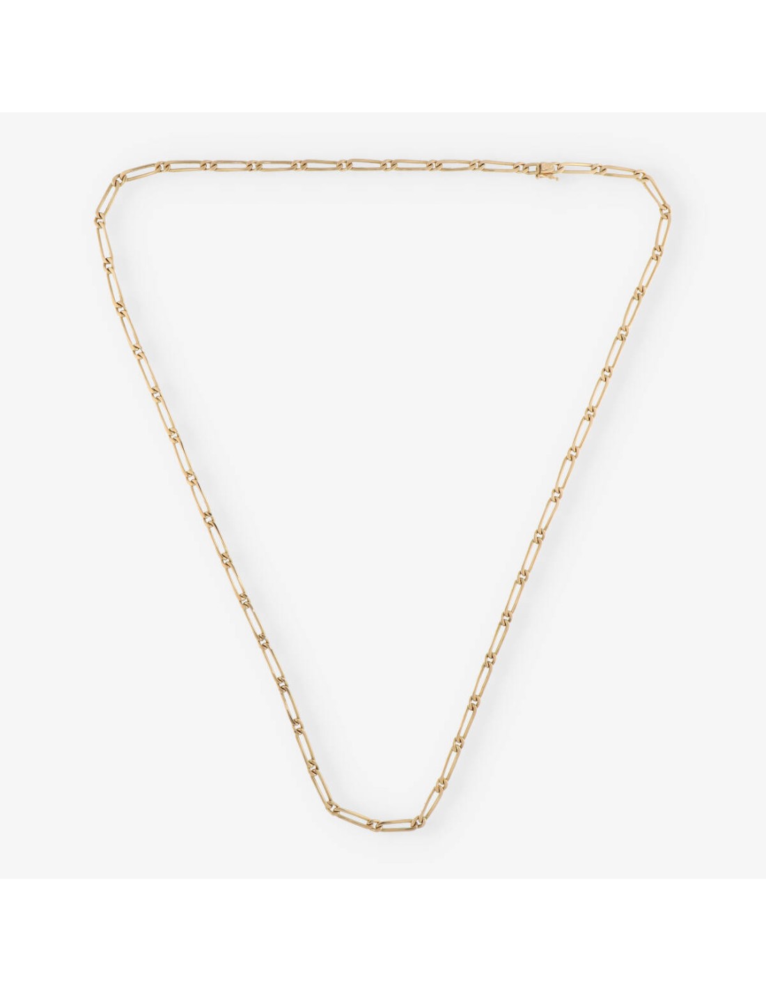 Maravillosa cadena de segunda mano en oro amarillo de primera ley. Con un gran diseño alternado el tamaño de las piezas que lo vuelve en un perfecto regalo para los amantes de las cadenas. Longitud: 80cm. Grosor: 0.4cm. Peso: 46.14gr.