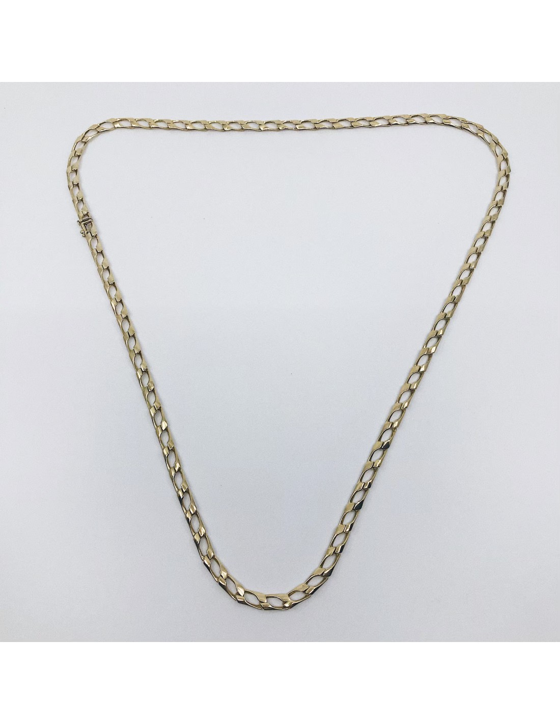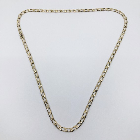 Magnífica cadena de segunda mano en oro amarillo con un precioso diseño de eslabones largos que encajan perfectamente unas con otras. Longitud: 84cm. Peso: 76,7gr.