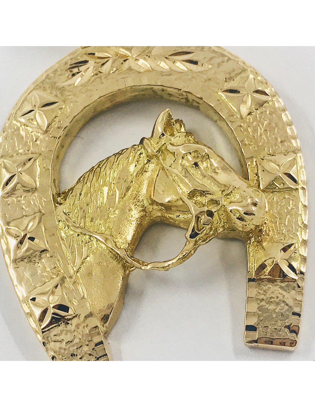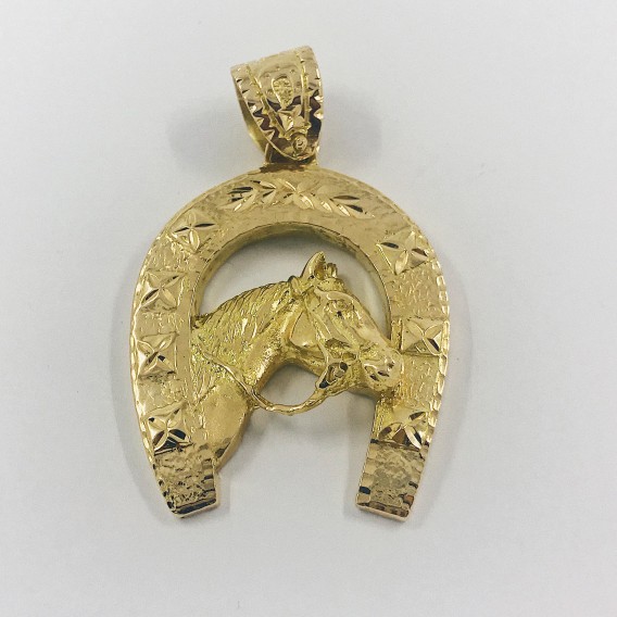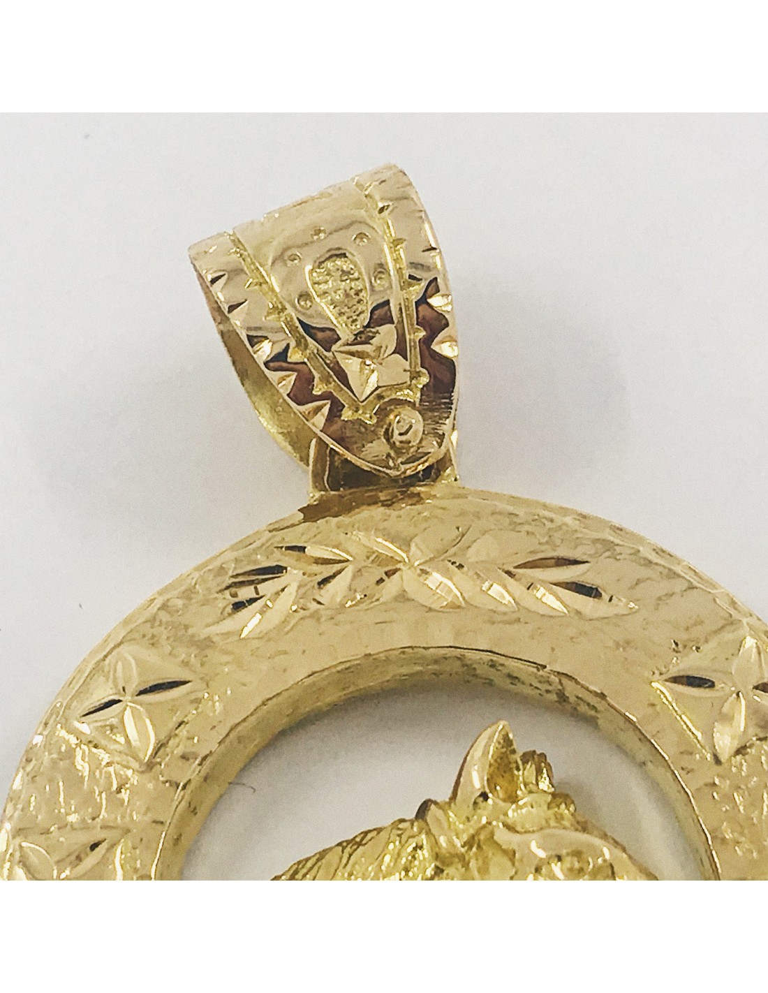 Colgante en forma de herradura de 18kt. Distintivo colgante de oro con forma de herradura y el caballo en el centro. Ancho: 4cm. Alto: 6cm. Peso: 32,80.