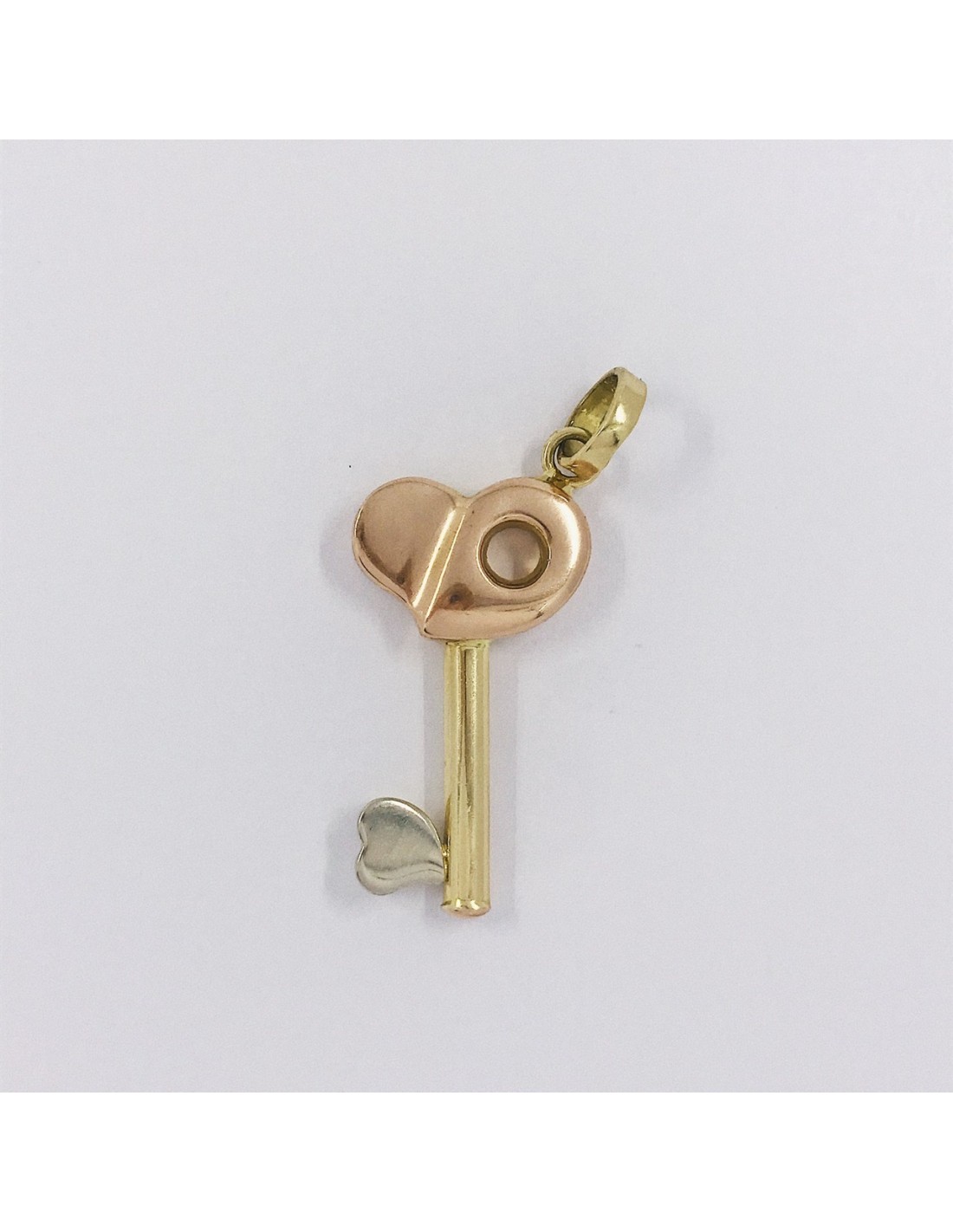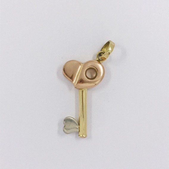 Magnifico colgante en forma de llave de segunda mano en oro amarillo, blanco y rosa de primera ley y con un acabado en corazón. tamaño: 3,1cm. Peso: 4,5gr.
