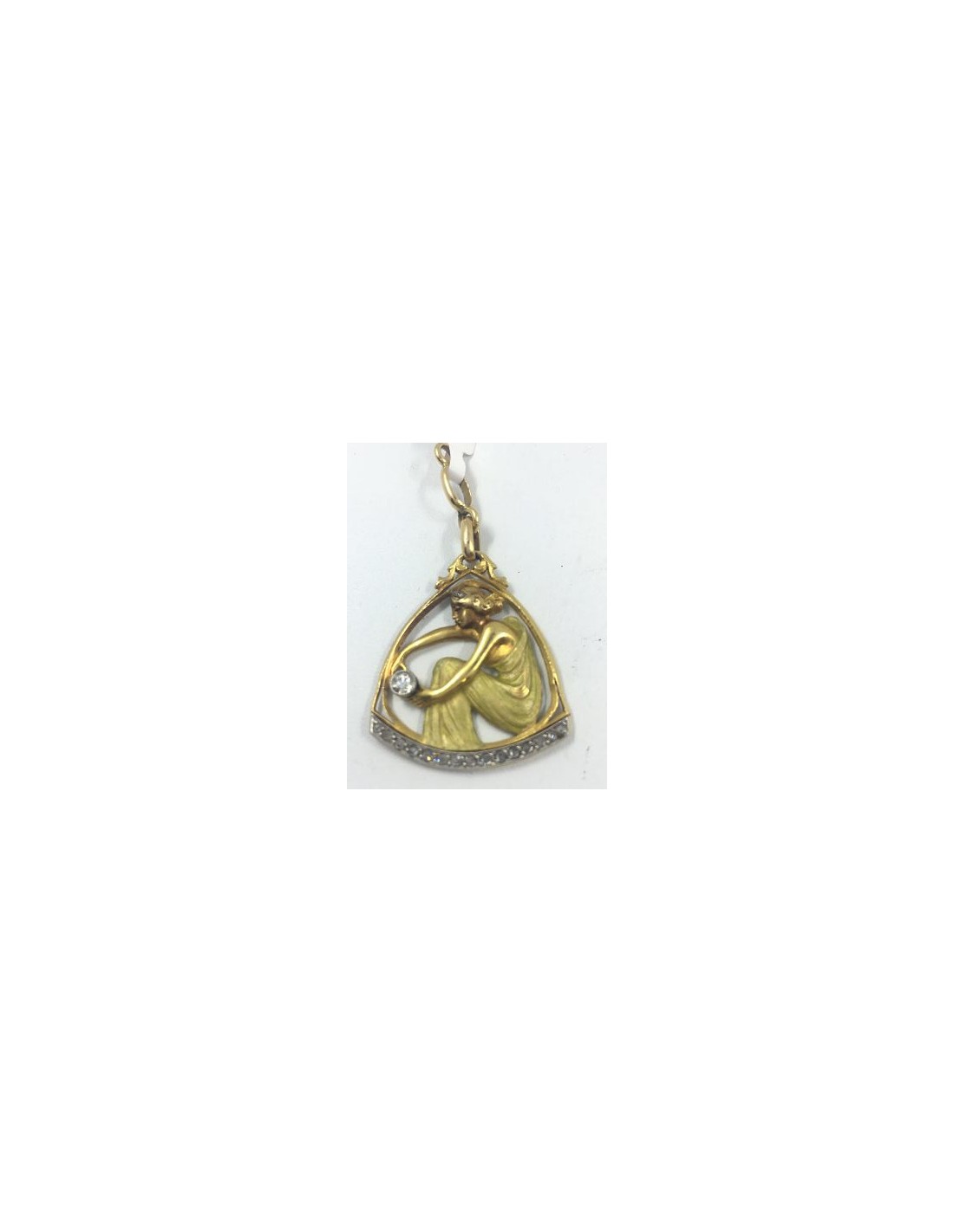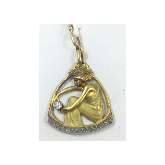 Colgante Masriera de segunda mano en oro amarillo y brillantes. Peso: 11,8 gr. Longitud: 5,4 cm.