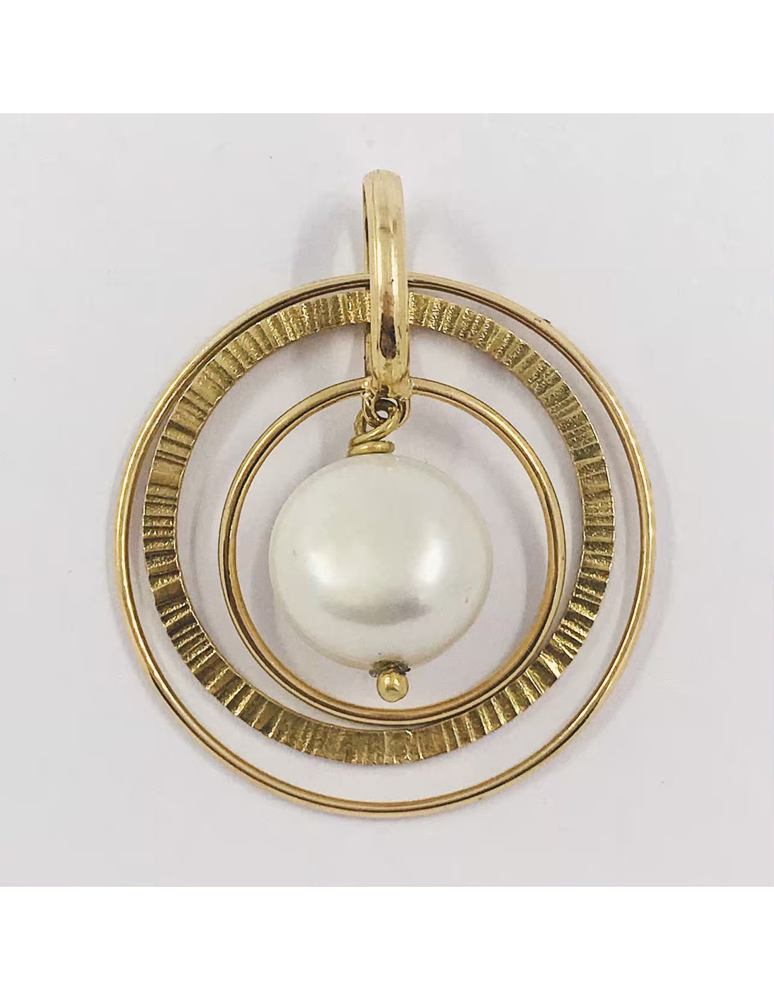 Precioso colgante de segunda mano en oro amarillo. Con un magnifico diseño en triple aro y perla central hacen de ella una pieza perfecta para lucirlo en todo momento.