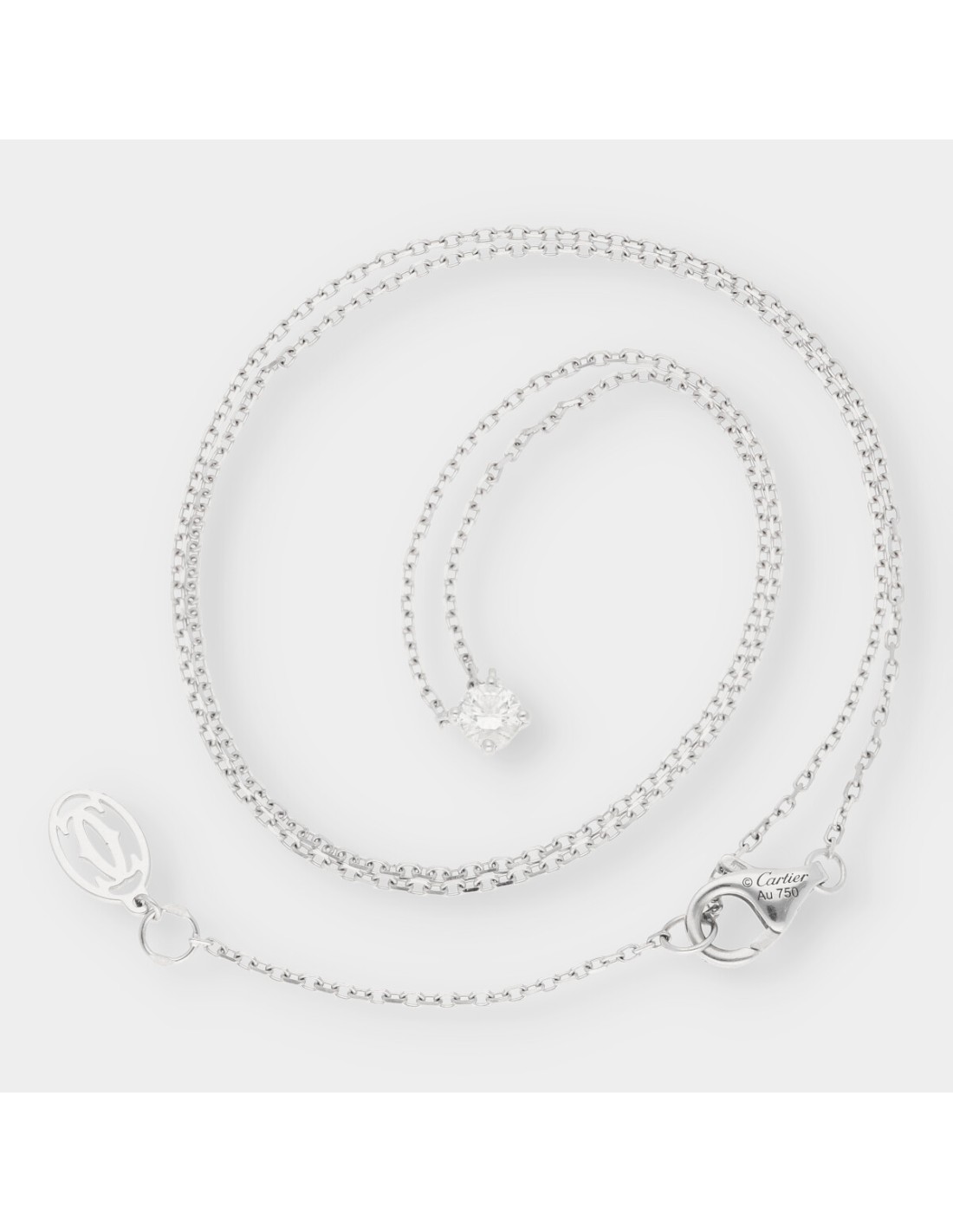 Collar Cartier de segunda mano en oro blanco de primera ley con un magnífico brillante central. Longitud (ajustable): 43cm. Peso: 2.1gr.