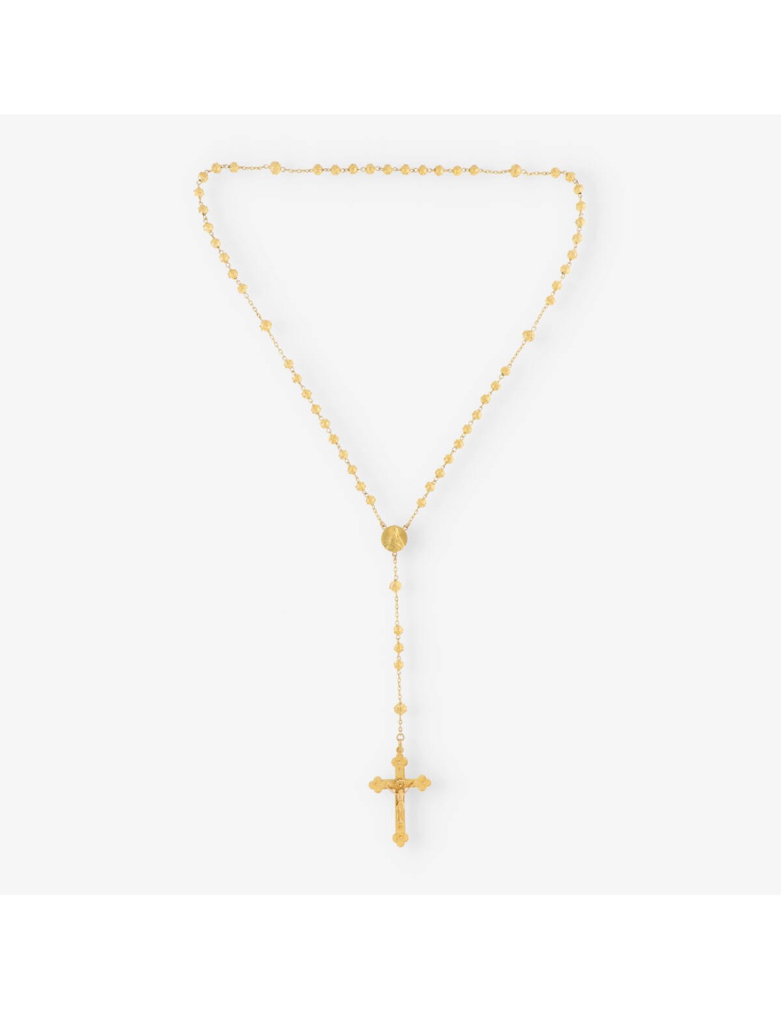 Collar rosario de segunda mano en oro amarillo de primera ley. Terminado en una cruz. Longitud (cerrado): 40cm. Peso: 18.06gr. Alto (cruz): 4.5cm. Ancho (cruz): 2.7cm.