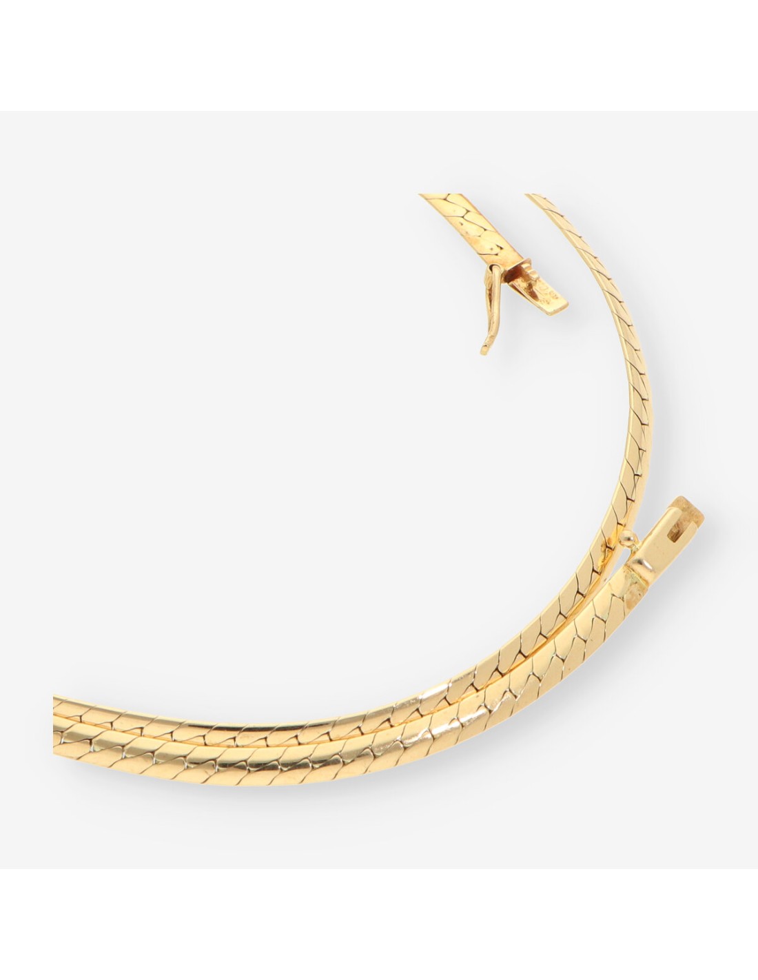 Presentamos esta elegante gargantilla semirrígida en oro amarillo de primera ley. Con una longitud de 46 cm y un ancho de 0.3 cm, y un peso de 18 gramos, esta pieza es perfecta para añadir un toque de refinamiento a cualquier atuendo. Ideal para eventos formales o como un complemento sutil en tu vestuario diario.