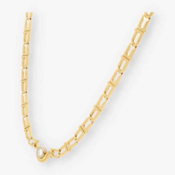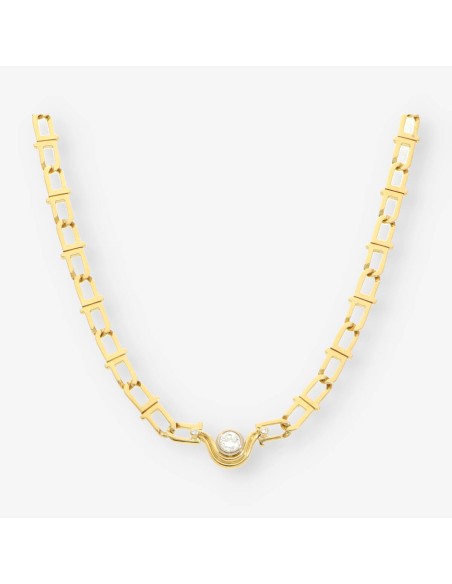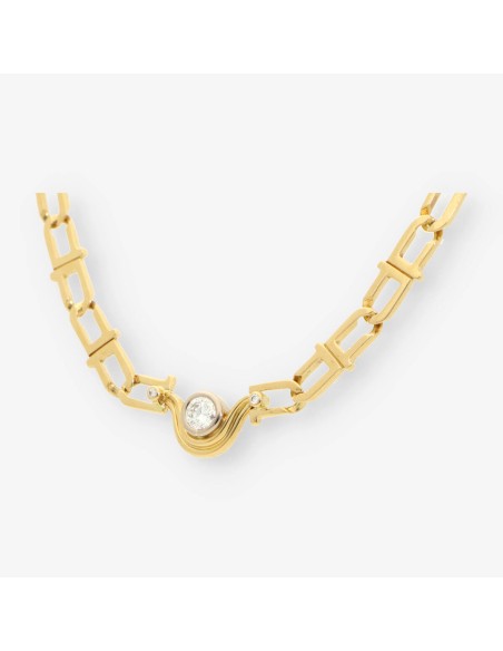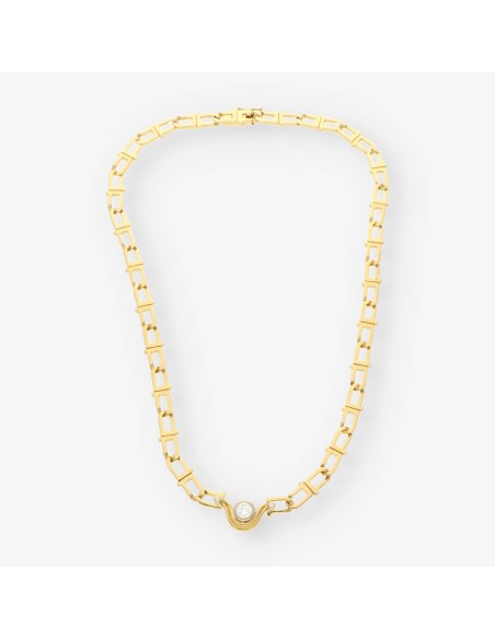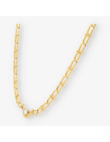 Maravillosa gargantilla Puig Doria de segunda mano en oro amarillo de primera ley. Con un gran diseño que lo vuelve en una pieza perfecta para los amantes de este estilo de joyerías. Longitud: 39cm. Peso: 28.1gr.