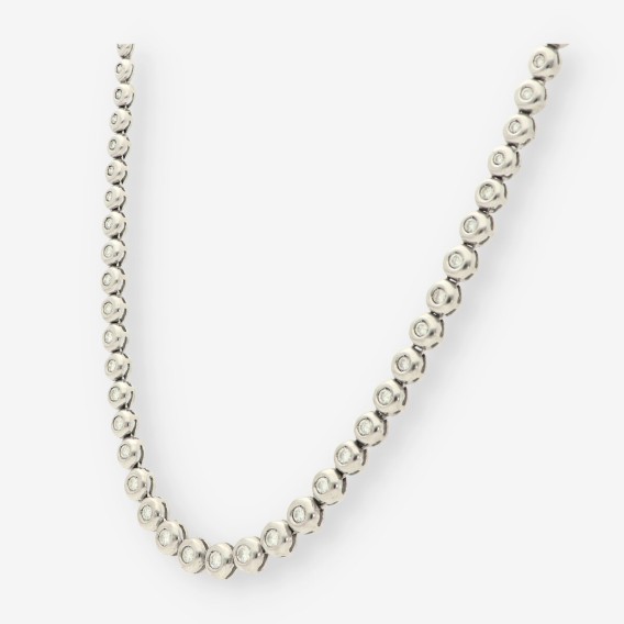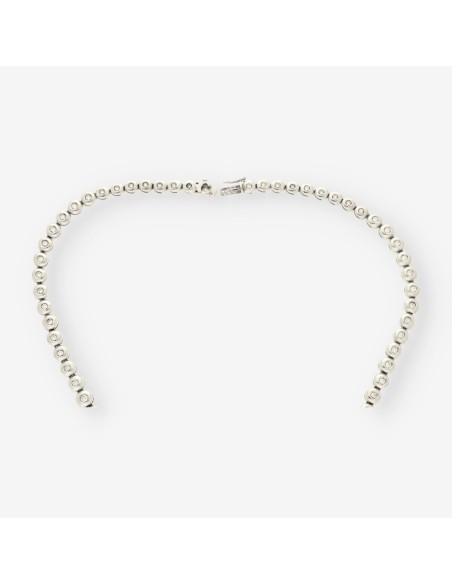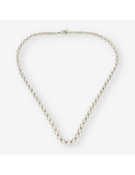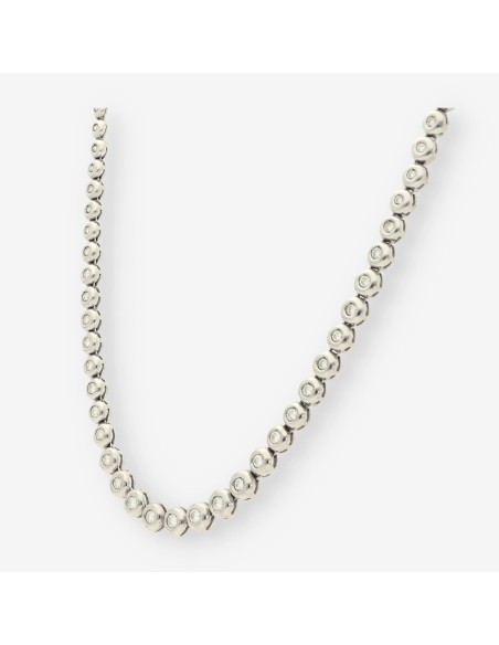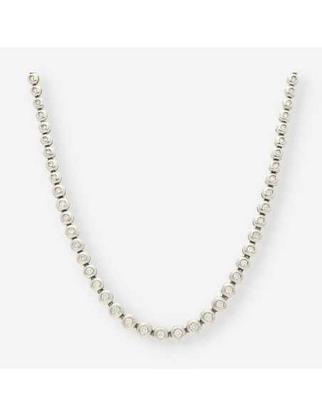 Gargantilla Rivière en oro blanco de 18 quilates con diamantes en degradé, una pieza elegante y sofisticada. Los diamantes, engastados en chatón, realzan su diseño atemporal y refinado. Con una longitud de 44 cm y un peso de 38,7 g, esta joya es perfecta para quienes buscan distinción y brillo en cada detalle.