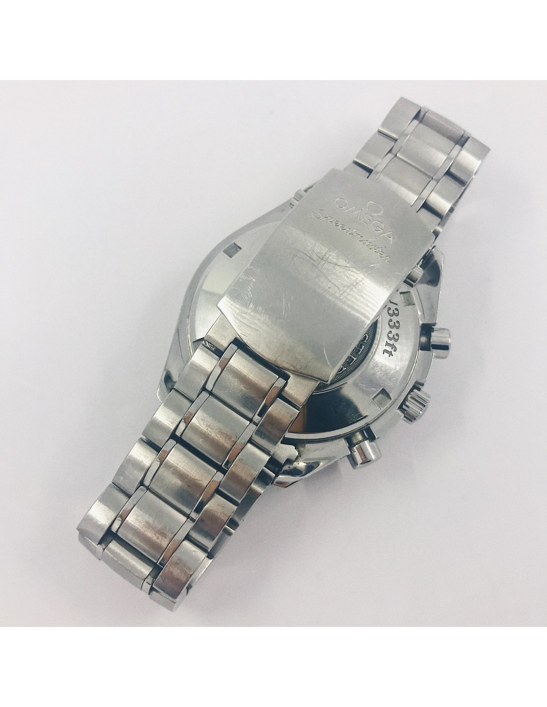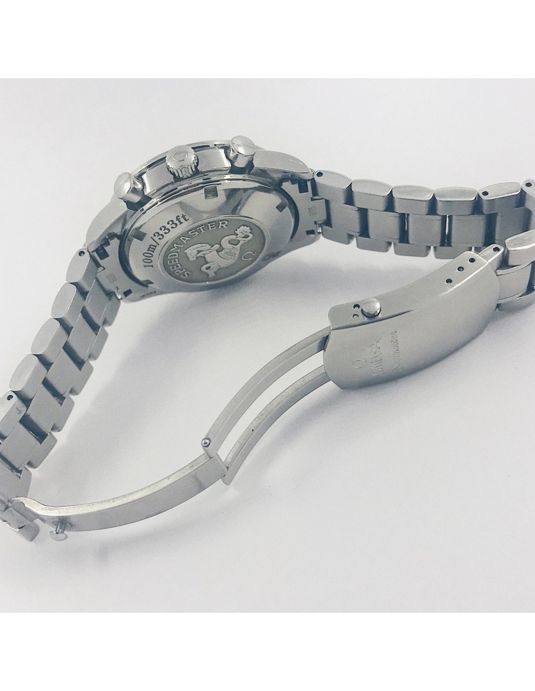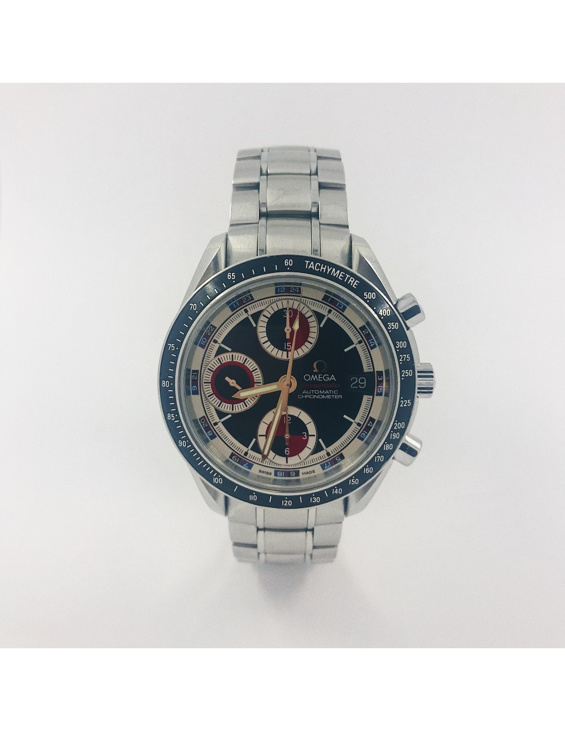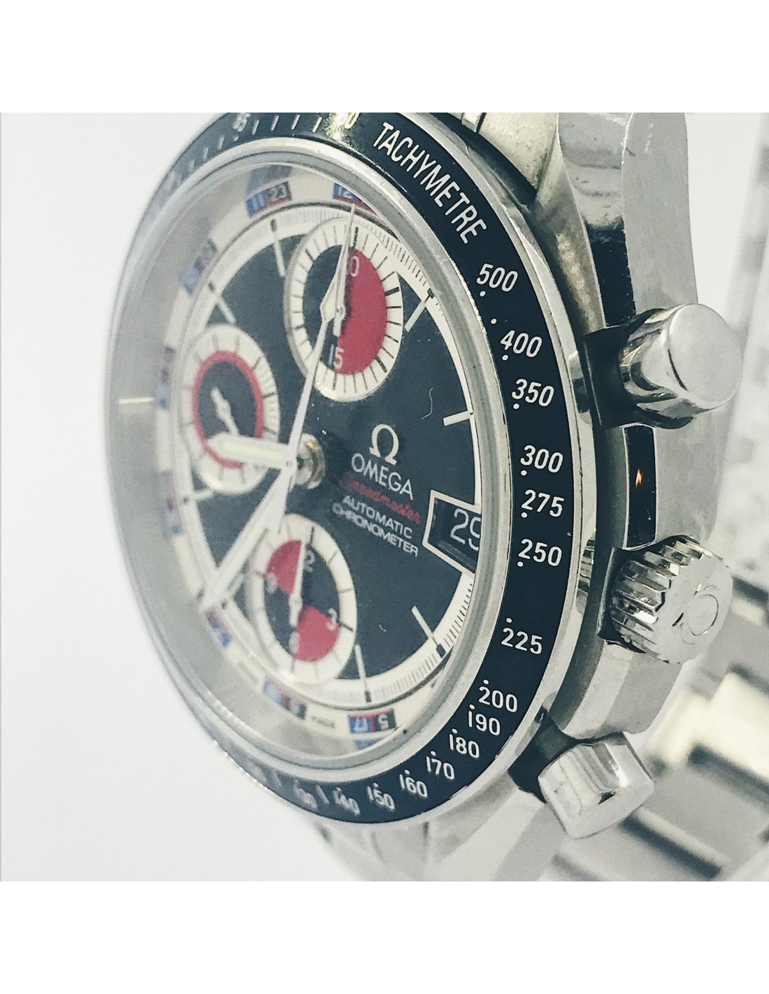 Reloj Omega Speedmaster de segunda mano en negro y rojo en perfecto estado de marcha y conservación. Ref: 3210.52.00, cuerda automática del calibre 1164, caja en acero de 40mm y Cristal zafiro abovedado y resistente a rayaduras resistente al agua (100 metros), Con el segundero a las 9, correa en acero y cierre de desbloqueo por botones en acero.
