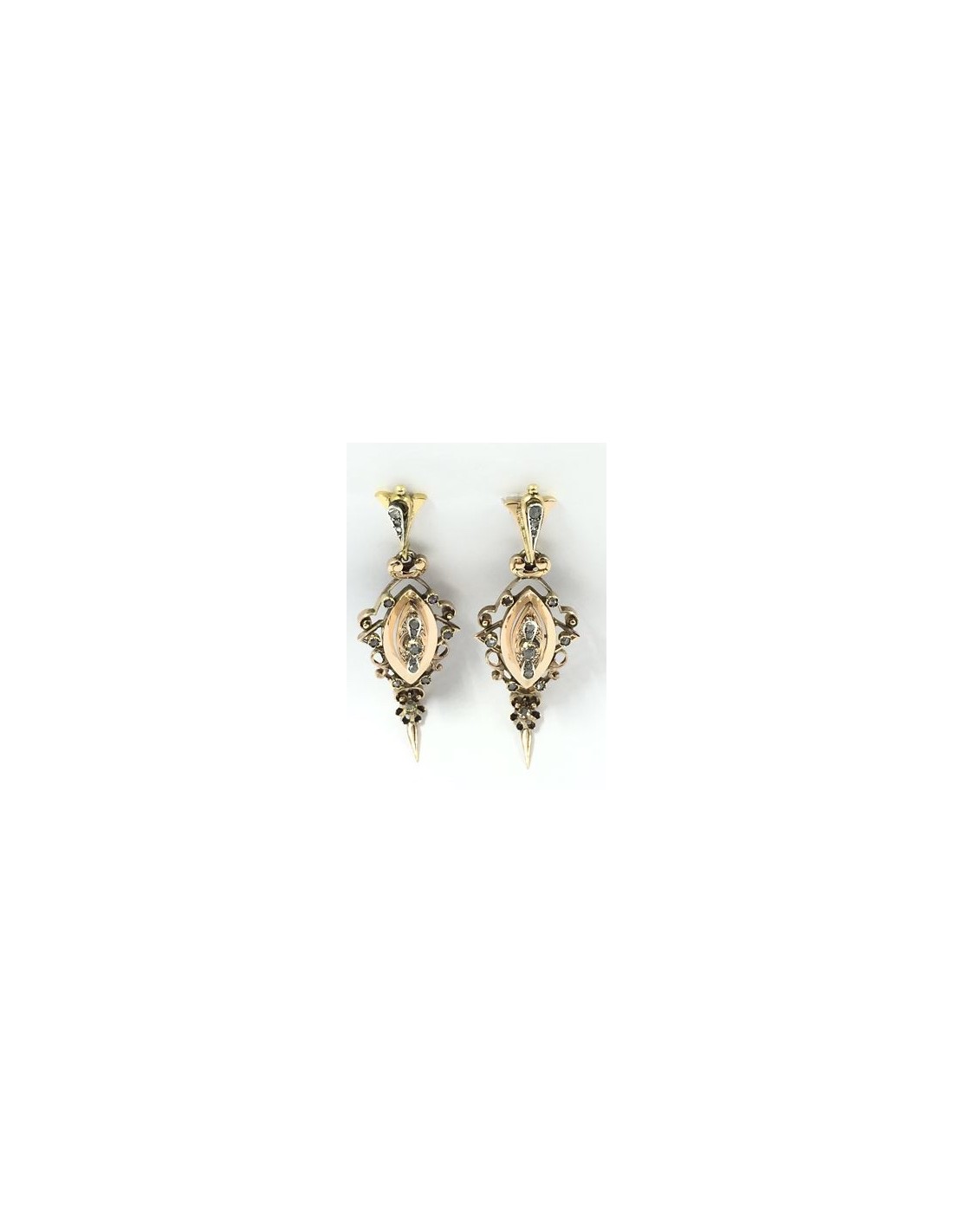Pendientes antiguos de segunda mano en oro rosa de 18 kt. y diamantes. Longitud: 5,8 cm. Peso: 11 gr.