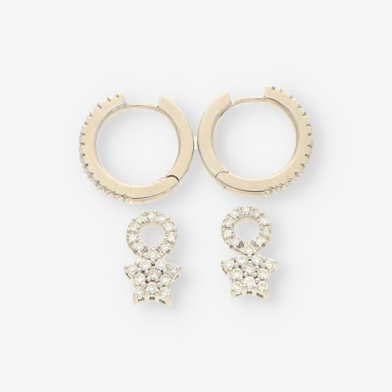 Estos pendientes de segunda mano, elaborados en oro blanco de primera ley, presentan un diseño elegante de aro adornado con brillantes y una estrella que se puede separar. Con un diámetro de 1.5 cm y una estrella de 1.1 cm de alto, y un peso total de 6.5 gramos, ofrecen la versatilidad de usarse con o sin la estrella. Perfectos para quienes buscan un accesorio adaptable y sofisticado, estos pendientes son ideales para cualquier ocasión, ya sea diaria o especial.
