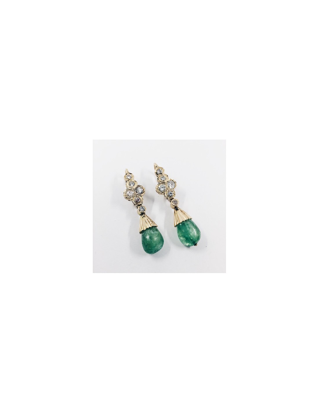 Pendientes de segunda mano en oro amarillo de 18 kt., brillantes y esmeraldas. Longitud: 6,5 cm. Peso: 34,1 g.