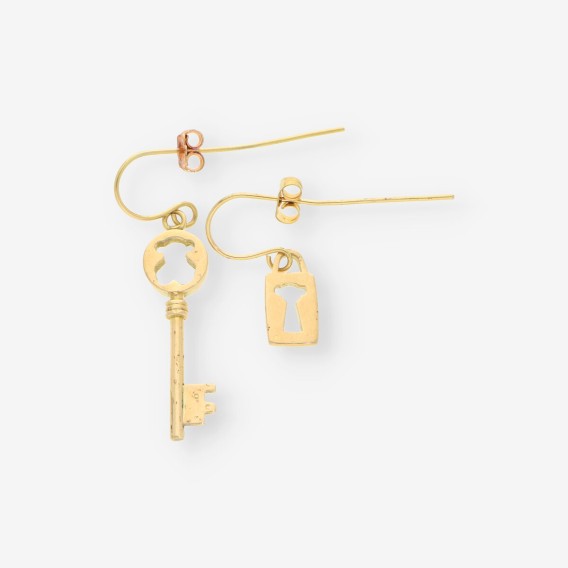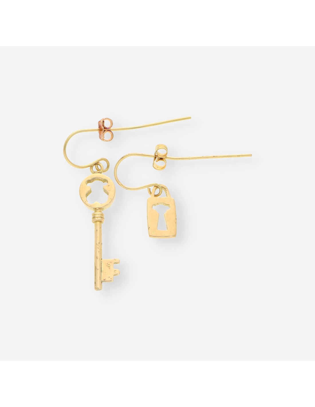 Pendientes largos en oro de primera ley con un diseño creativo de llave y cerradura, símbolo de unión y misterio. Su originalidad los convierte en una pieza distinta y con carácter, ideal para destacar con estilo. El pendiente con llave mide 4,5 cm de alto y el de cerradura 2,5 cm, con un peso total de 5,3 g.
